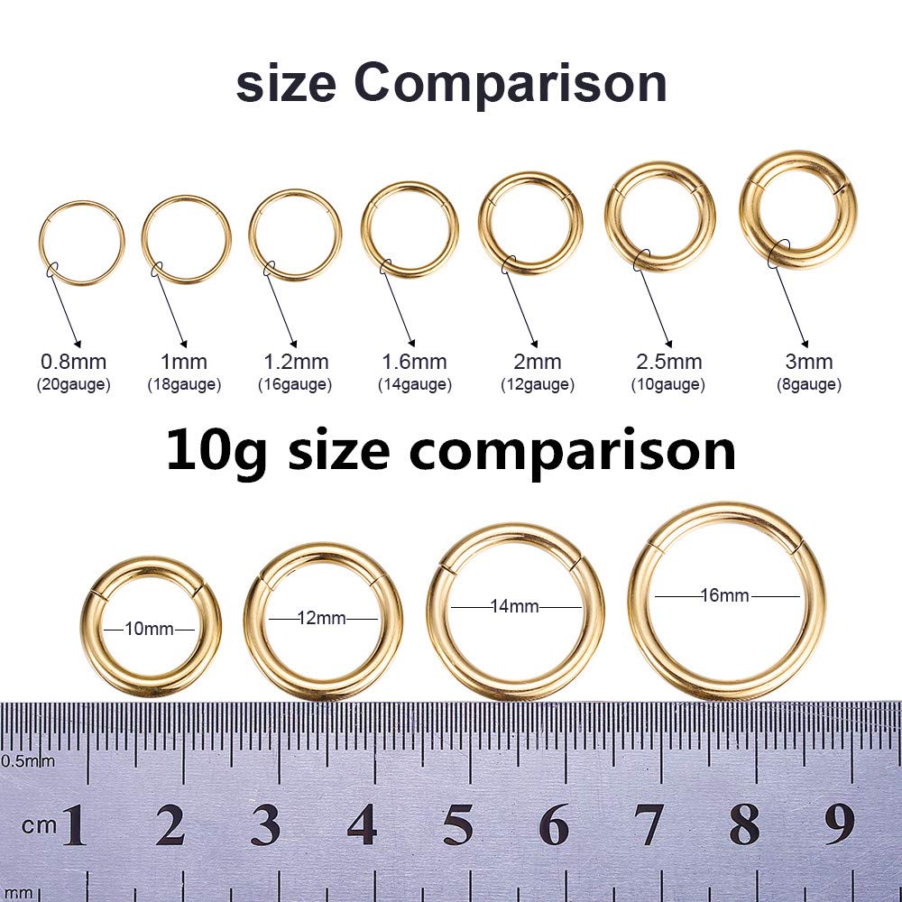 Sold individually Nose Hoop Ring/Earring Hoop Size: 10 gauge (thickness: 2.5mm), inner diameter 25/64 inches(10mm ),Please choose your gauge and diameter hoop for your nose piercing needs.It has a smooth closure that doesn't slipped or opened. It's still tight after long-term use.