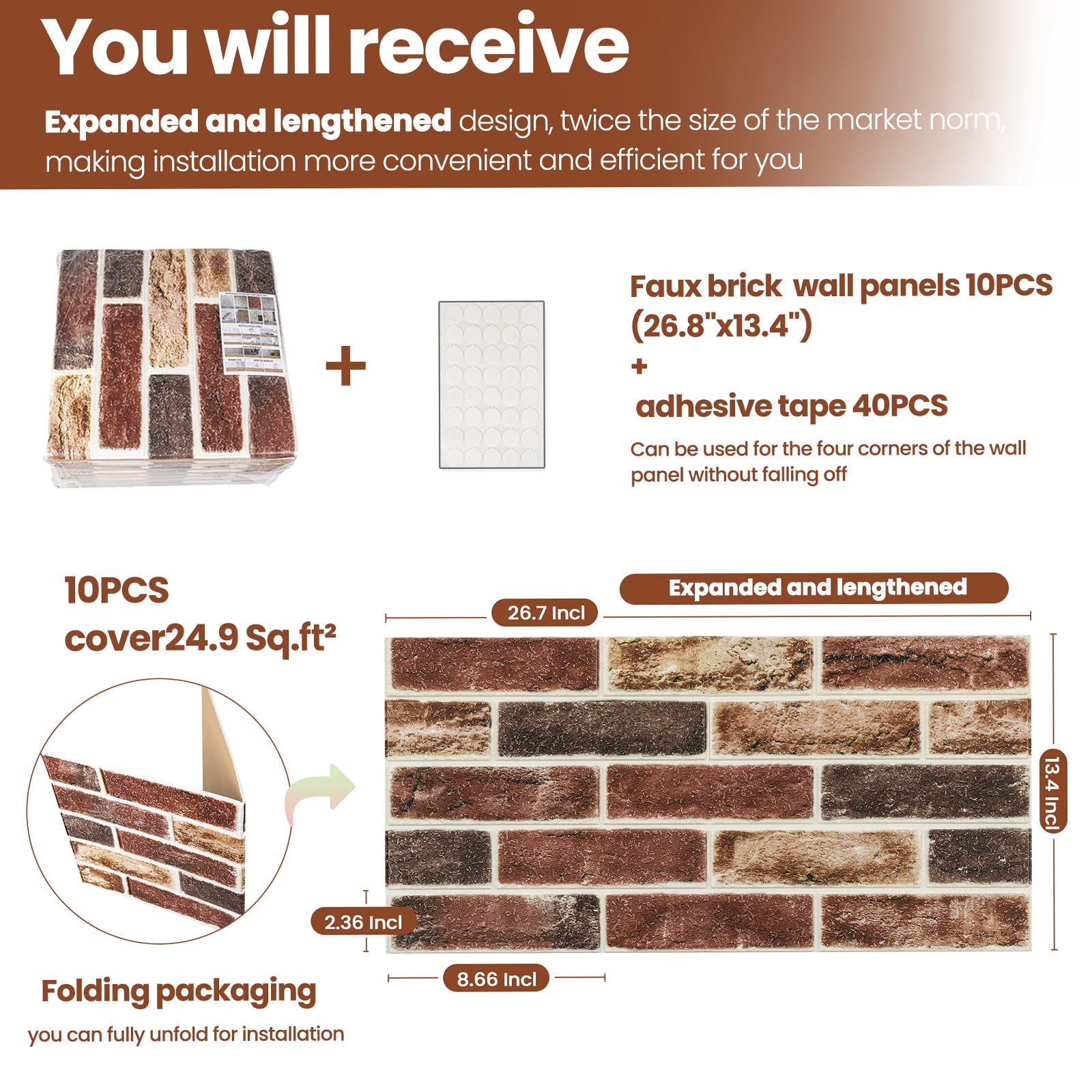 Premium PVC Material: Our 3D wall panels are crafted from high-quality PVC plastic, designed to last and withstand everyday wear. These faux brick panels have a thickness of 0.4 cm, providing a realistic 3D depth effect. Each panel measures 13.4 in x 26.7 in, and the set of 10 tiles can cover 24.9 square feet, making them ideal for both interior and exterior wall applications, including decorative veneer or feature walls