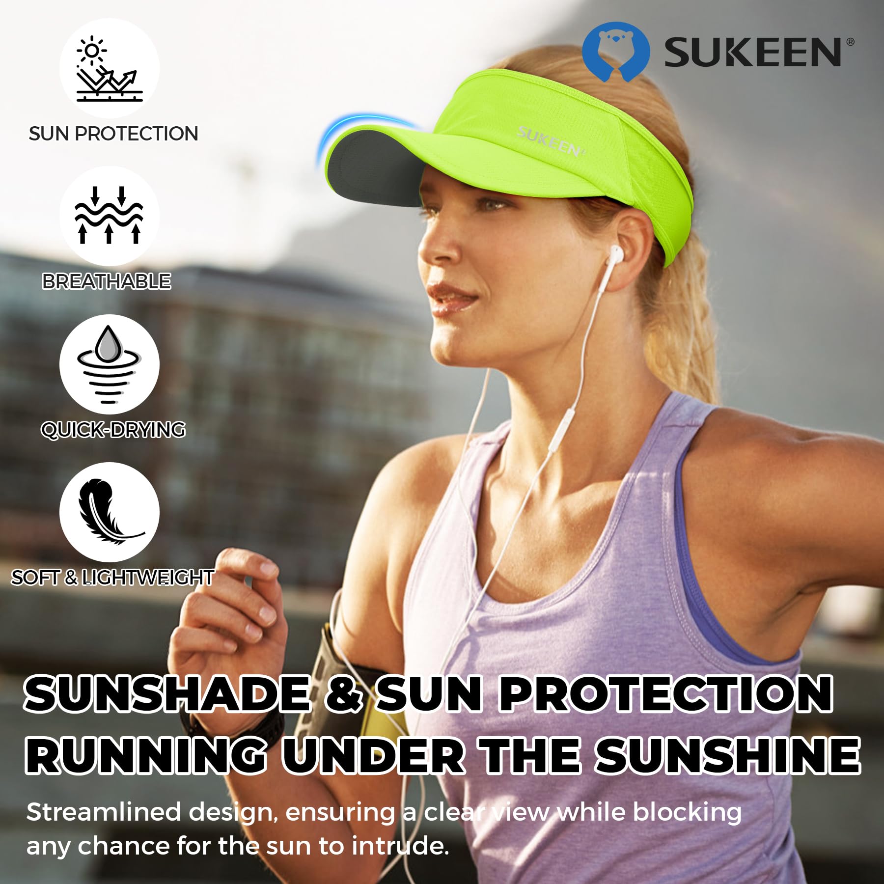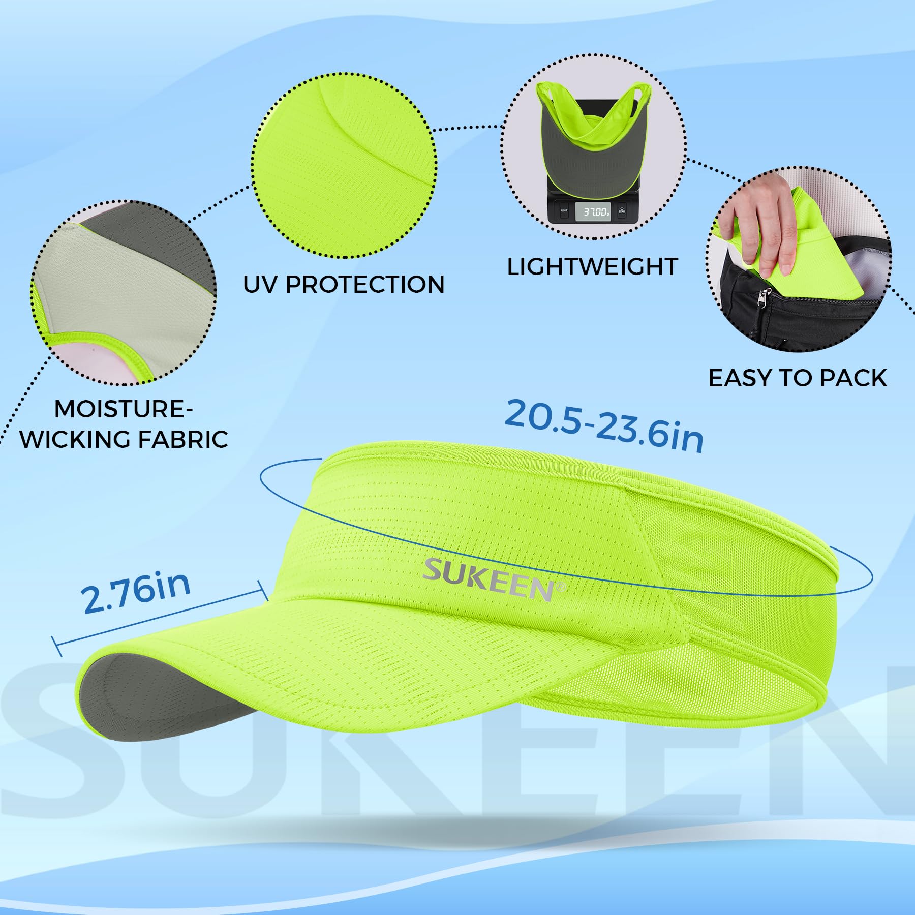 LIGHTWEIGHT & PACKABLE: The Sukeen Lightweight Sports Sun Visor is made with lightweight materials, including a superior HDPE material for the brim board. With a weight of only 37g, this visor provides long-lasting comfort without any head pressure. Additionally, its soft fabric allows for easy storage in a bag or pocket, making it an ideal choice for on-the-go outdoor activities.