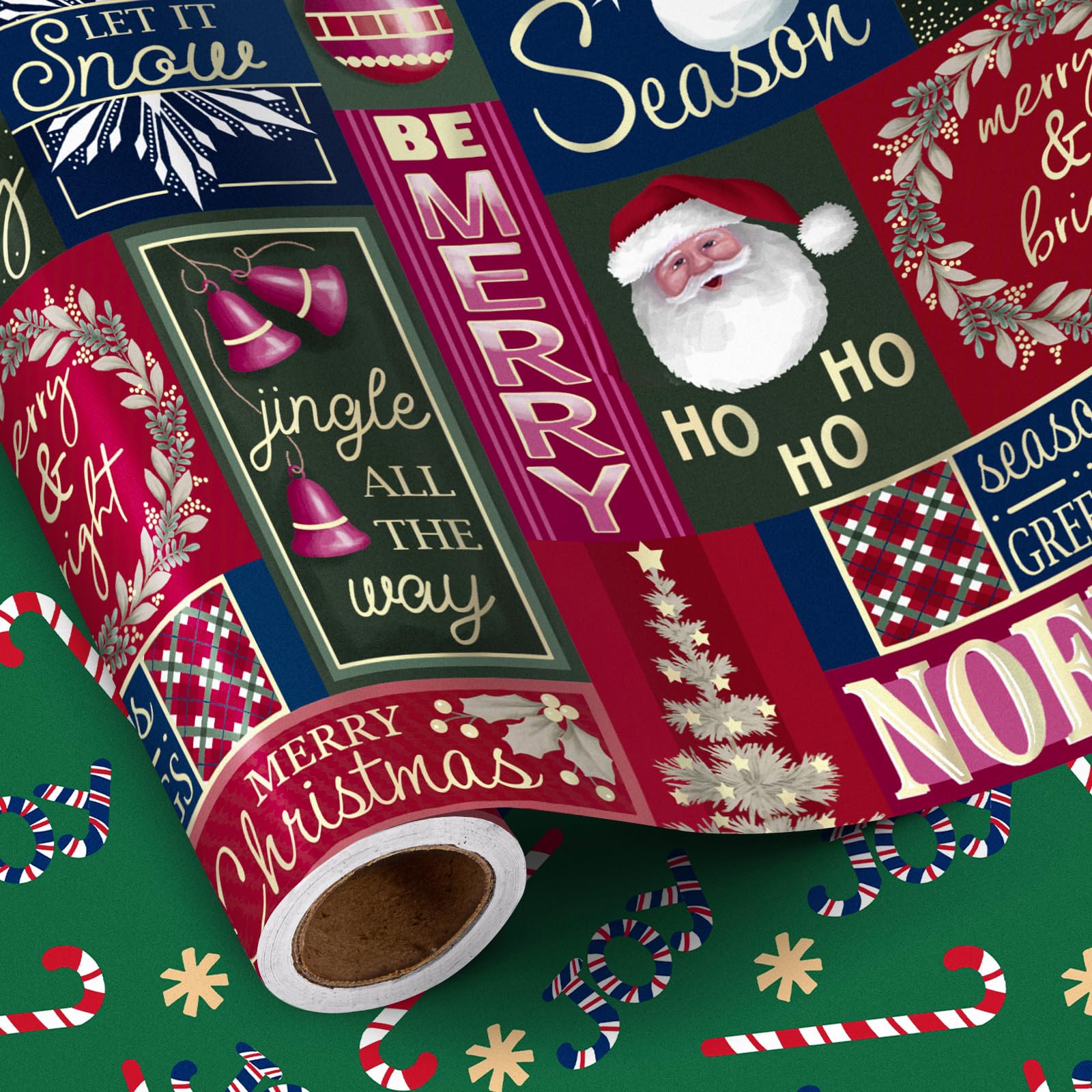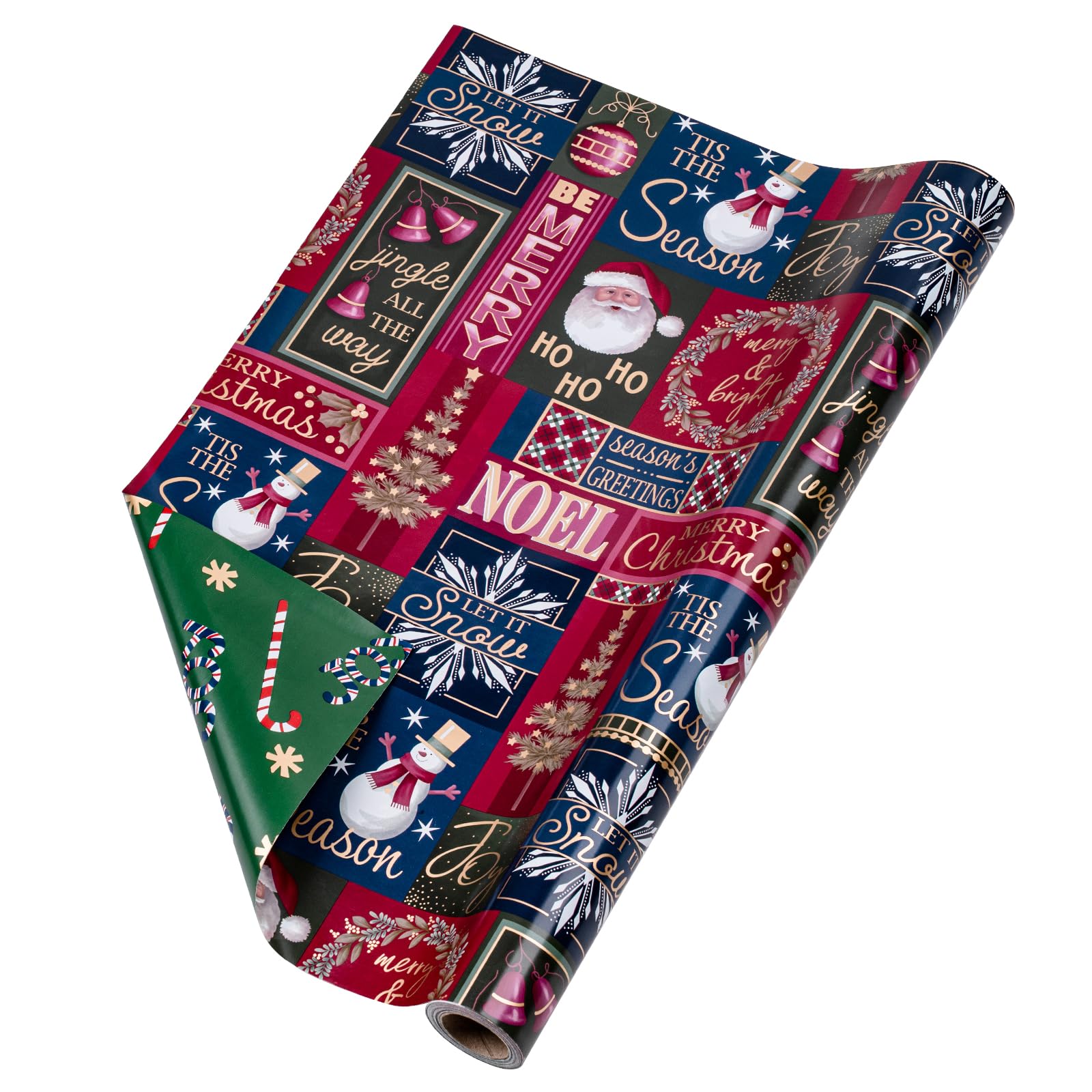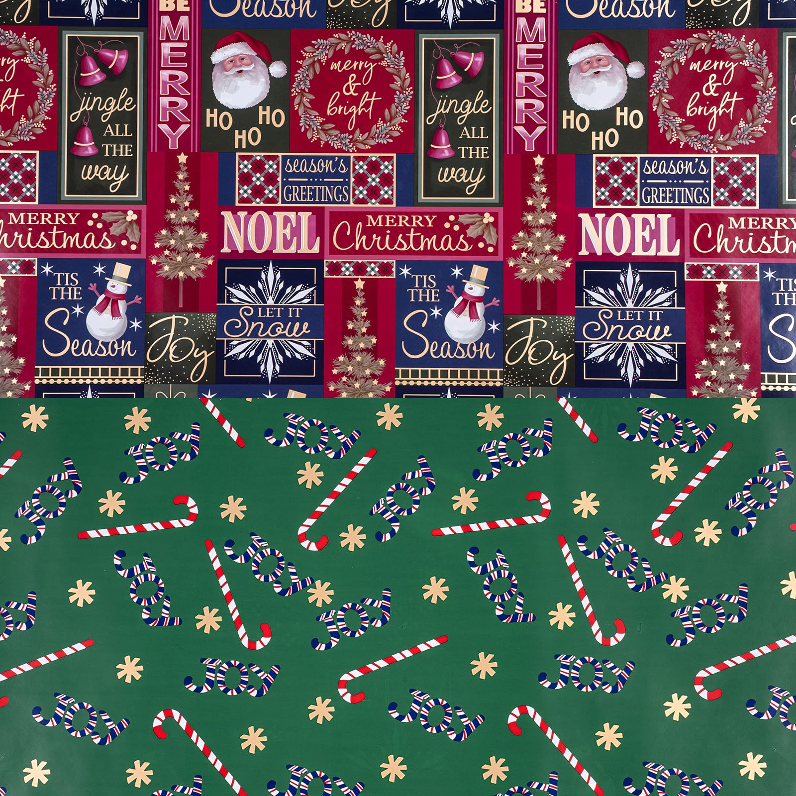 REVERSIBLE: Beautiful santa claus and snowman printed on one green side, candy cane and "JOY" printed on the reverse. Two different designs make unique and varied gift presentations easy