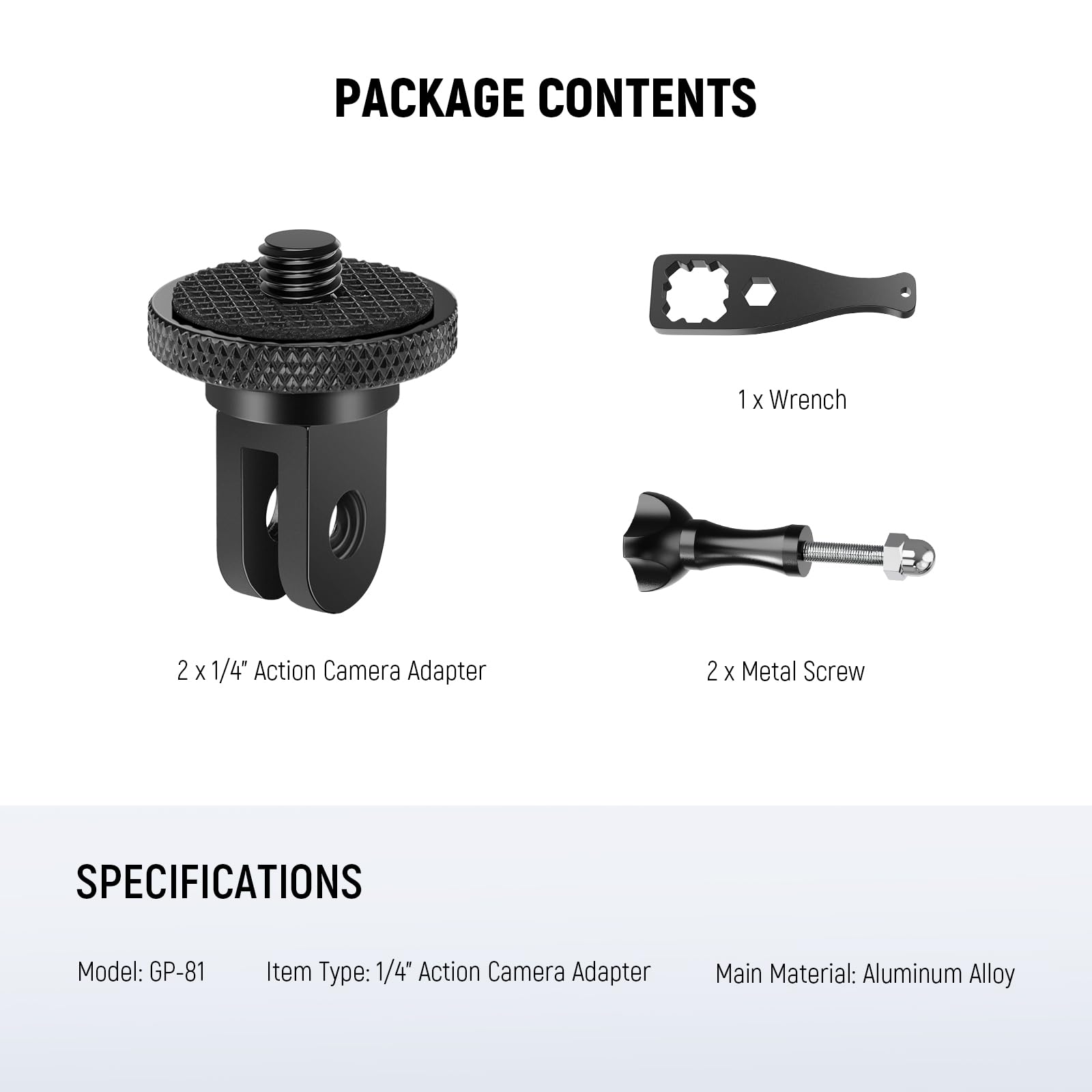 【Package Contents】 2 x 1/4" Action Camera Adapter, 2 x Metal Screw, 1 x Wrench