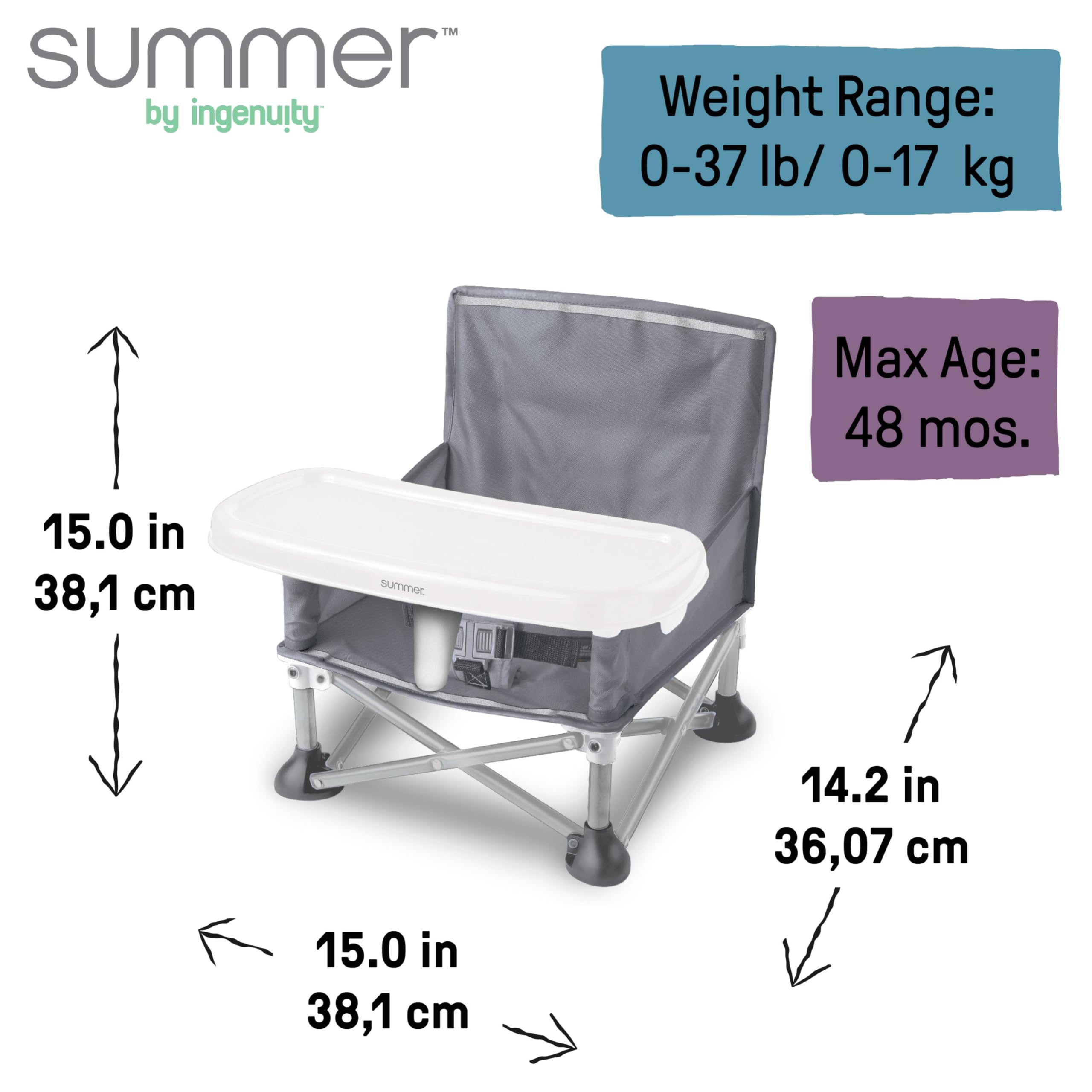 The original Summer Pop 'N Sit Portable Booster is the ultimate go & grow seat, with over 2 million sold worldwide! This #1 Booster Seat* has 3 modes of use: floor seat, feeding seat with removable tray, and toddler booster. For babies, attach to an adult chair using the included straps and BPA free tray to create a portable chair top high chair. For toddlers, use the seat as a booster that can pull up to the table by removing the tray. In floor mode, you can use the Pop ‘N Sit whenever you need an extra seat - picnics, sporting events, or right at home! The rear storage pocket holds your daily essentials. Folds compactly when not in use and includes a carrying bag with shoulder strap. This seat is a new parent must-have that requires no tools for assembly. Dishwasher safe tray. Seat and straps wipe clean with a damp cloth and mild soap. Folded dimensions: 15 x 13.5 x 14.75” or 5 x 15”. Made for 6 months to 3 years old or up to 37 pounds. Third party safety tested and approved. (*Circana, Retail Tracking Service, U.S., Highchairs-Boosters, dollar sales, Jan-Nov 2023 combined)