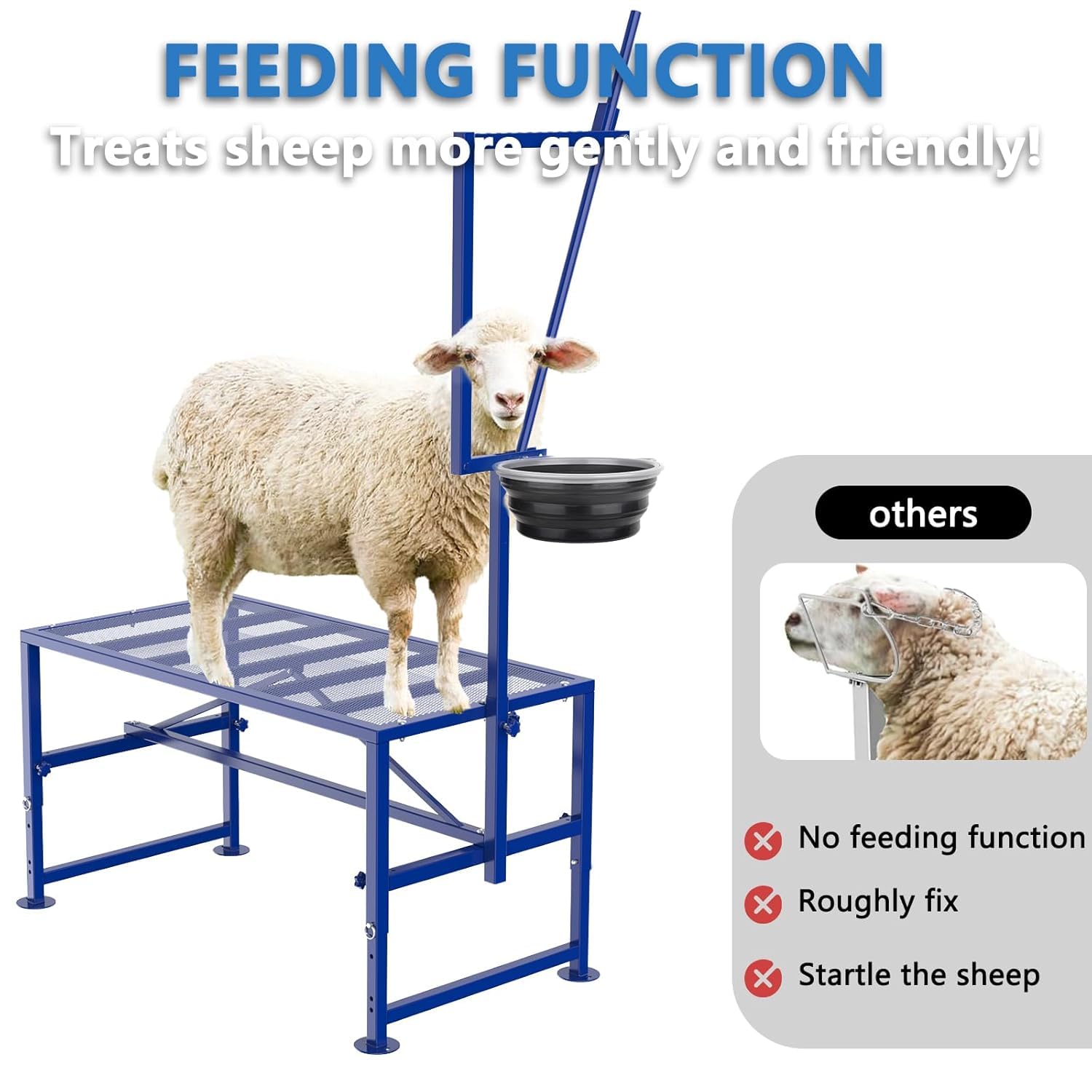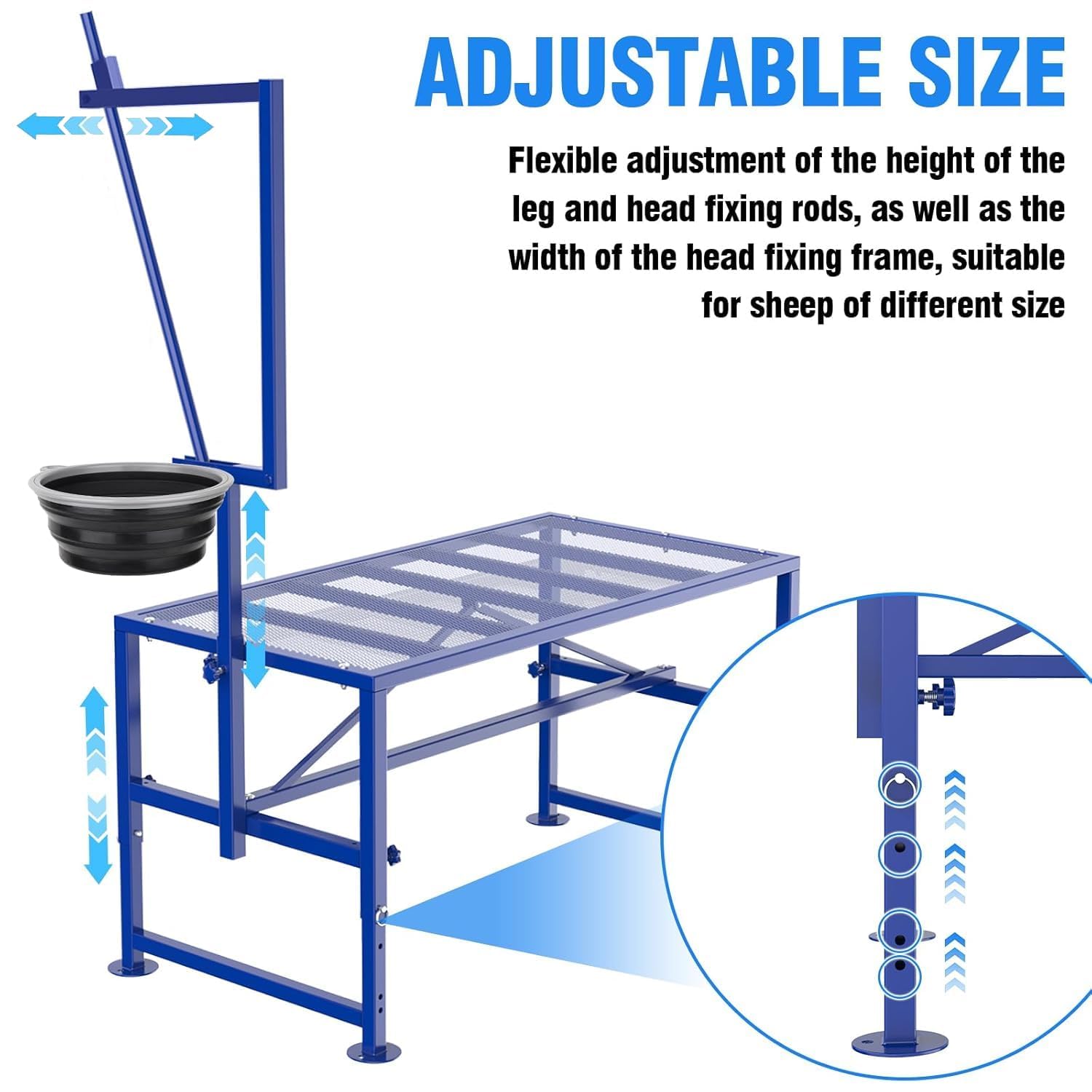 Adjustable Goat Stand- Adjustable design of the goat milking stand with feeder, makes it easy to use for different sheep. You could easily adjust the height of leg and head pole based on the height of the sheep; What's more, it's easy to adjust the space for fixing the head according to the size of the sheep's head.