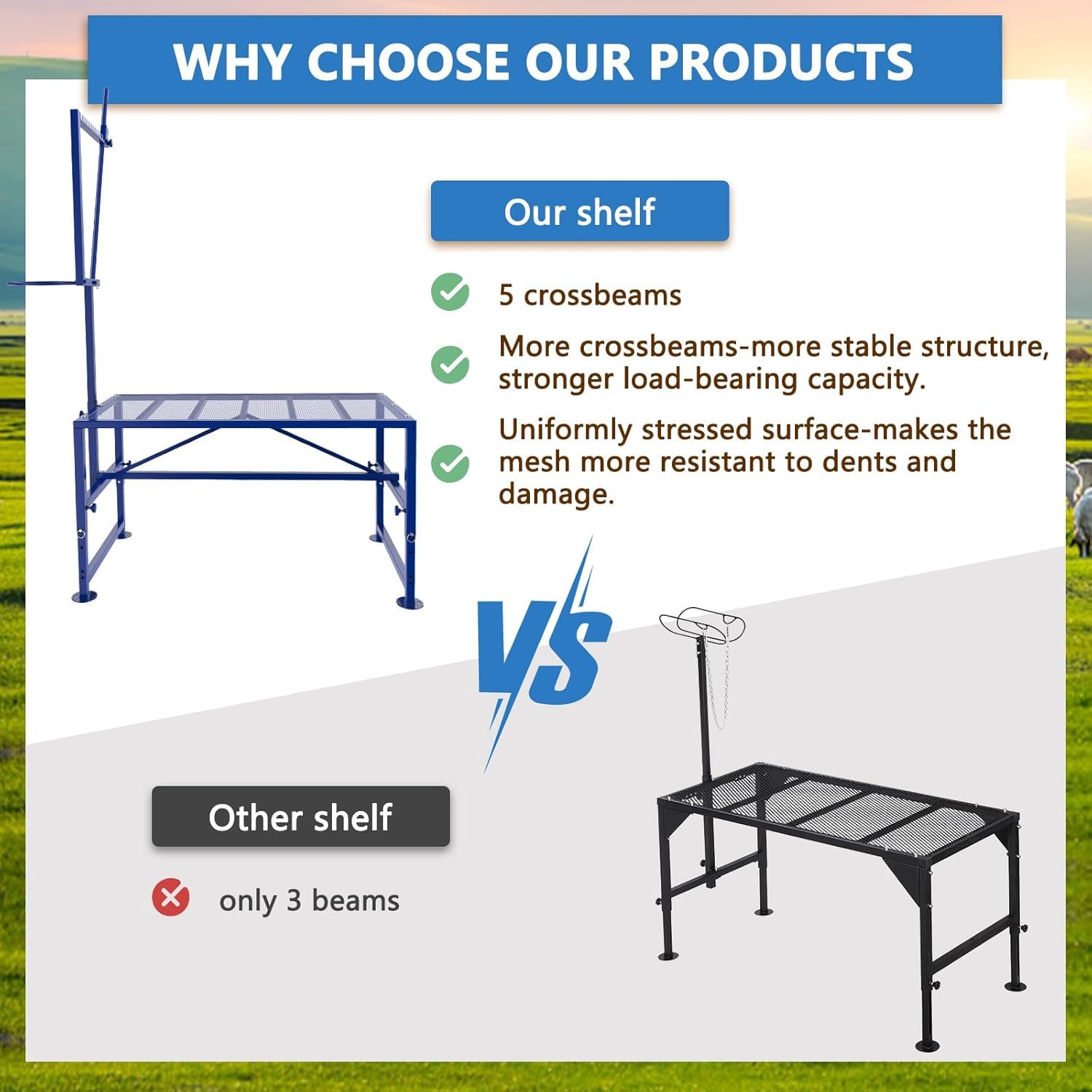 Sturdy 400LBs Goat Stand- Two additional load-bearing beams have been added In order to reinforce the expanded metal and to support up to 400LBs for sheep. The stable triangular frame design makes the livestock stand very sturdy and stable.