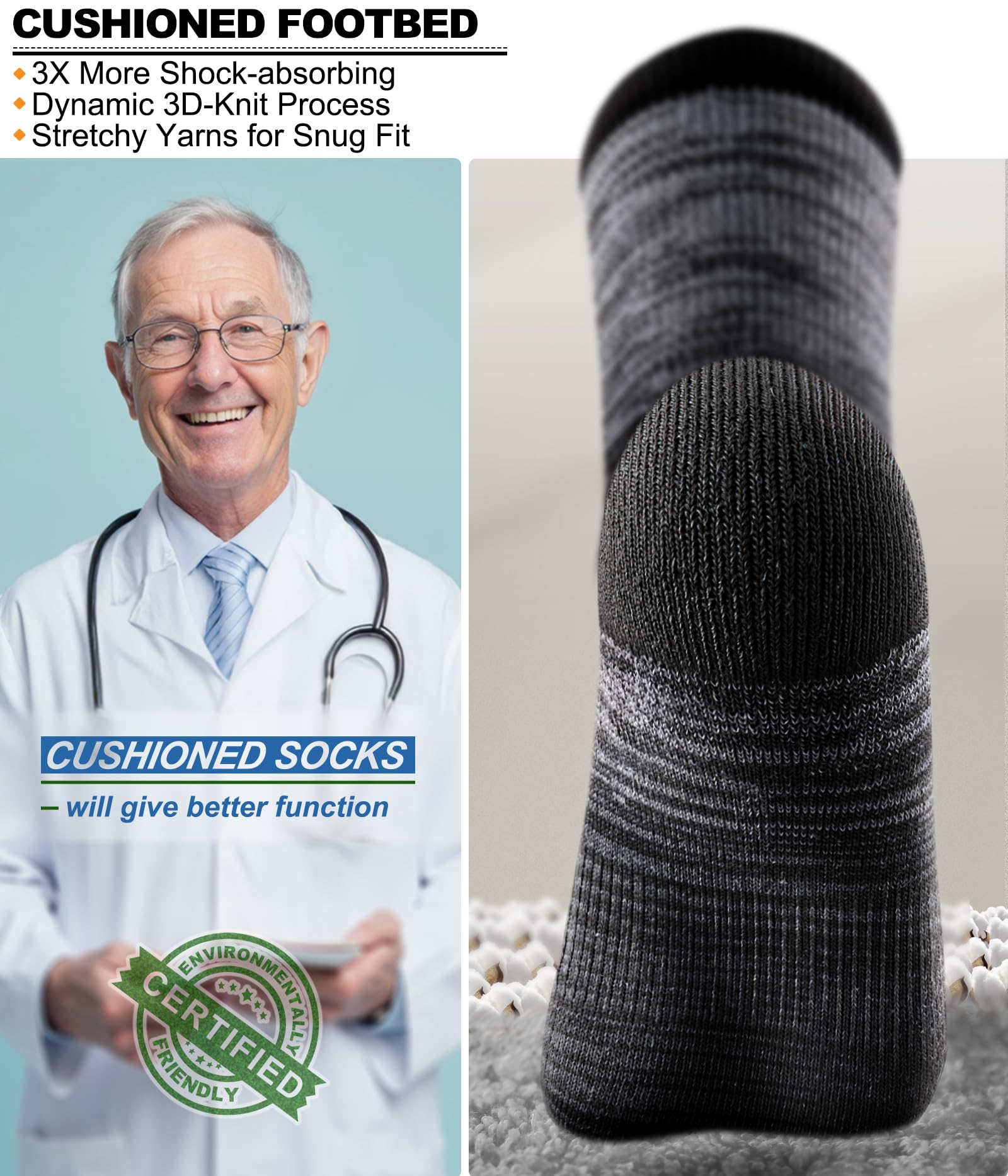 COMPRESSION -- With proper stitching density, Its particular material composistion of yarns mixed with spandex provides these crew socks proper elasticity and good compression to feet, which can promot blood flow for a more comfortable experience;