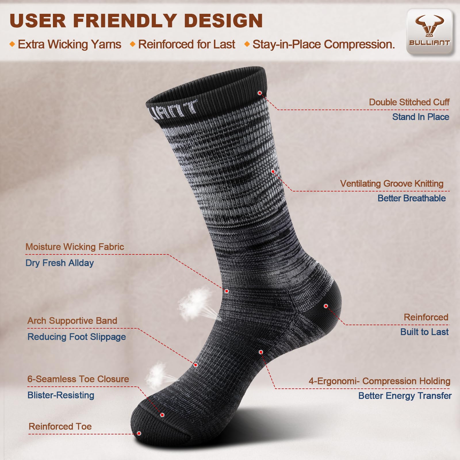 BREATHABLE -- Particular stitching construction with the unique moisture-wicking yarns creates anefficient ventilating system, These Bulliant running socks can keep feet dry and comfortable all the day;