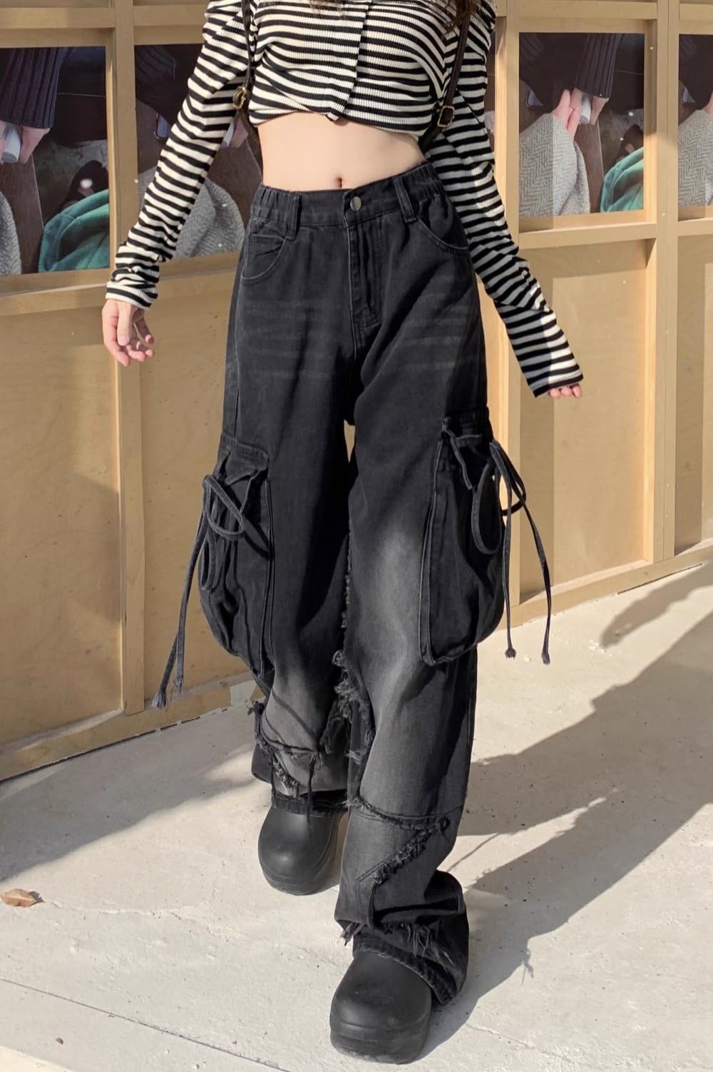 Oversized Fit with Bold Statement Details: Designed for a bold silhouette, these wide leg jeans combine edgy raw hem cuts, oversized side pockets, and faded washes for maximum street appeal. The baggy leg and loose fit deliver both comfort and attitude. A must-have for creating statement looks that align with alt girl, coquette, or urban grunge styles.