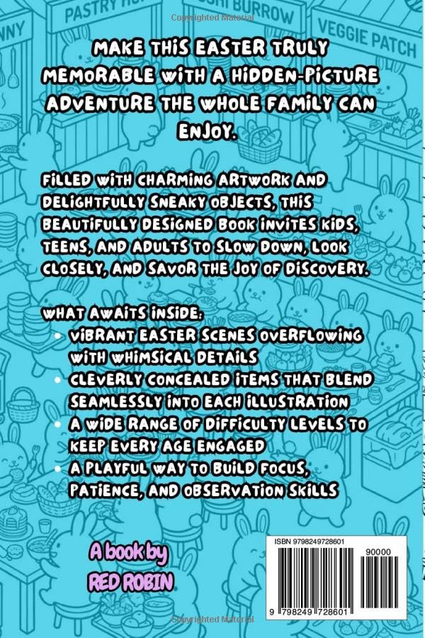 Make this Easter truly memorable with a hidden‑picture adventure the whole family can enjoy. Filled with charming artwork and delightfully sneaky objects, this beautifully designed book invites kids, teens, and adults to slow down, look closely, and savor the joy of discovery. What Awaits Inside Vibrant Easter scenes overflowing with whimsical details: see bunnies having fun swimming, taking part in adventurous water sports, in funfairs, shopping at the mall, eating sushi, sailing, surfing and so many more... Cleverly concealed items that blend seamlessly into each illustration A wide range of difficulty levels to keep every age engaged A playful way to build focus, patience, and observation skills Perfect For Easter basket surprises for kids and teens Cozy family activities and holiday traditions A screen‑free challenge that sparks curiosity Puzzle lovers of all ages who enjoy a good hunt Bring joy, wonder, and a touch of challenge to your Easter celebrations with Easter Hunt Challenge—a delightful gift that turns every page into a new adventure.