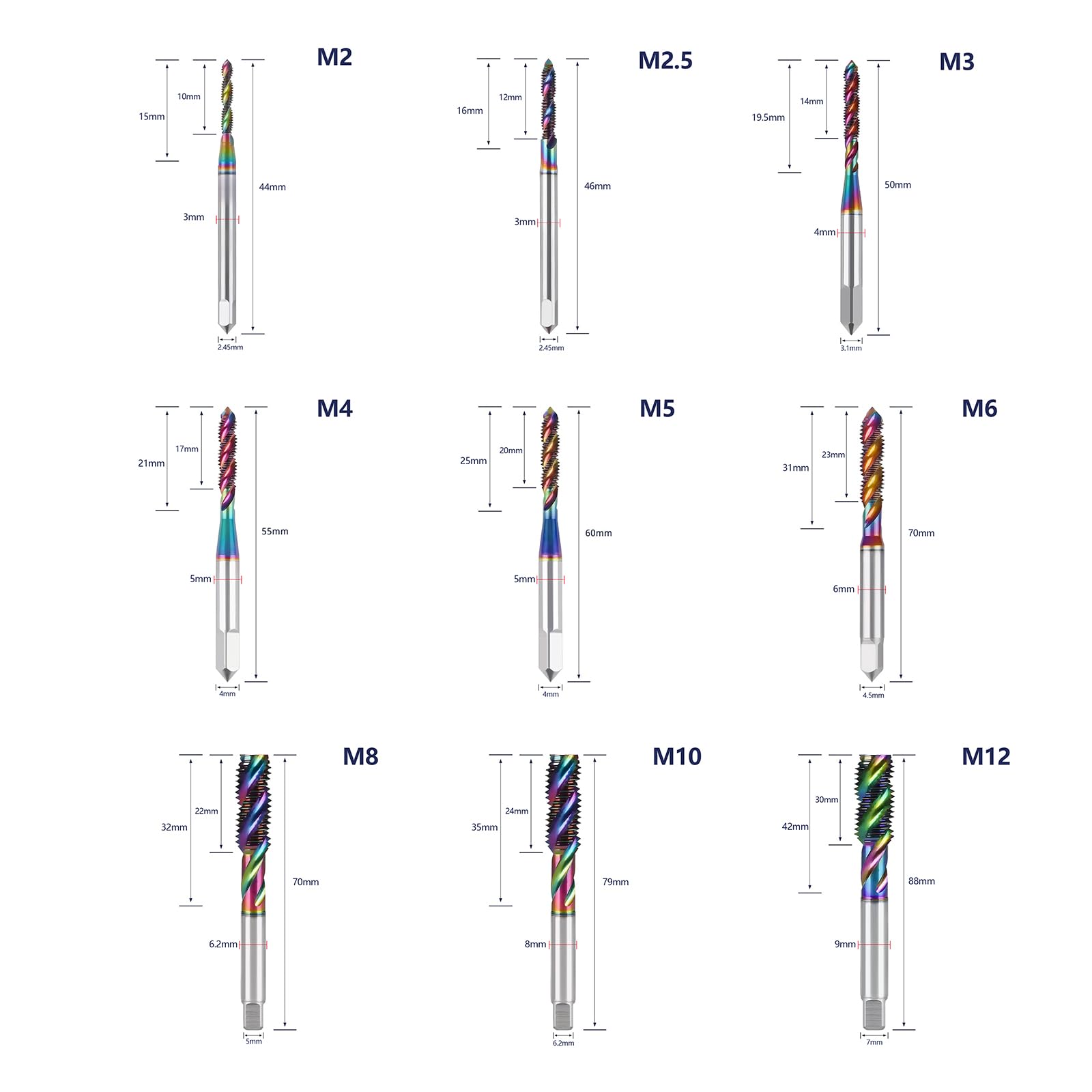 MATERIALS: The taps are made from M35 material and surface is coated with DLC for high hardness and rust resistance.