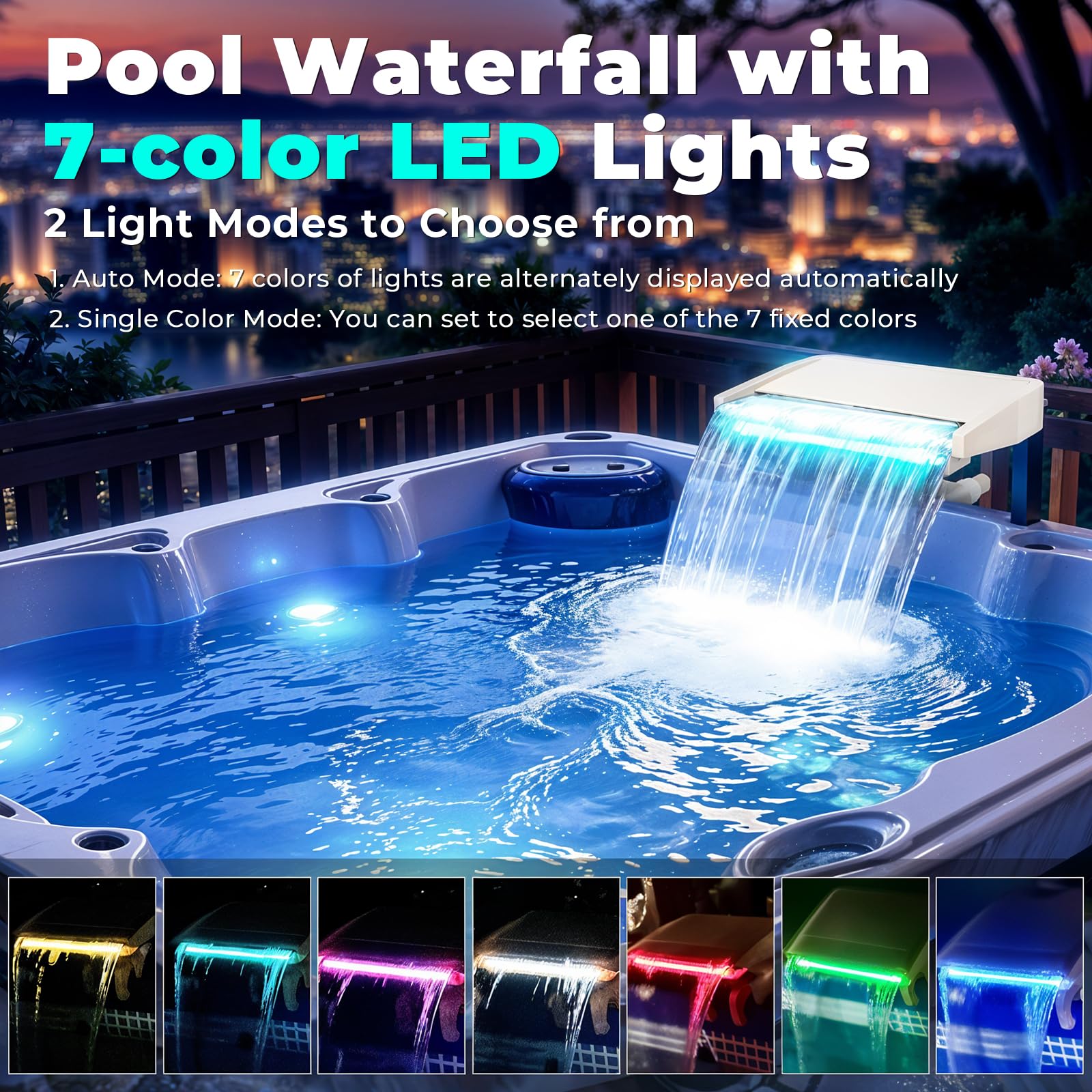 Multi-Color Modes: Featuring an array of dazzling lights with 7 light colors, this pool waterfall offers 7 single color modes and 1 alternating mode to choose from.