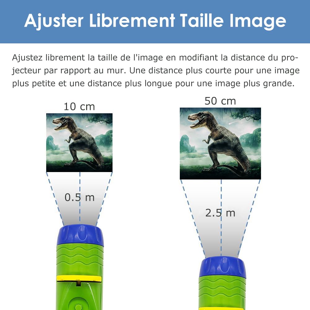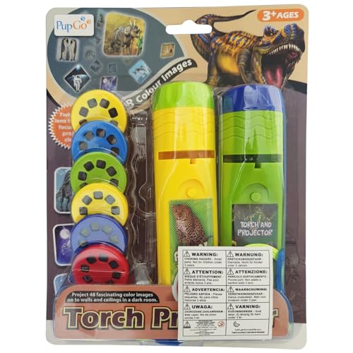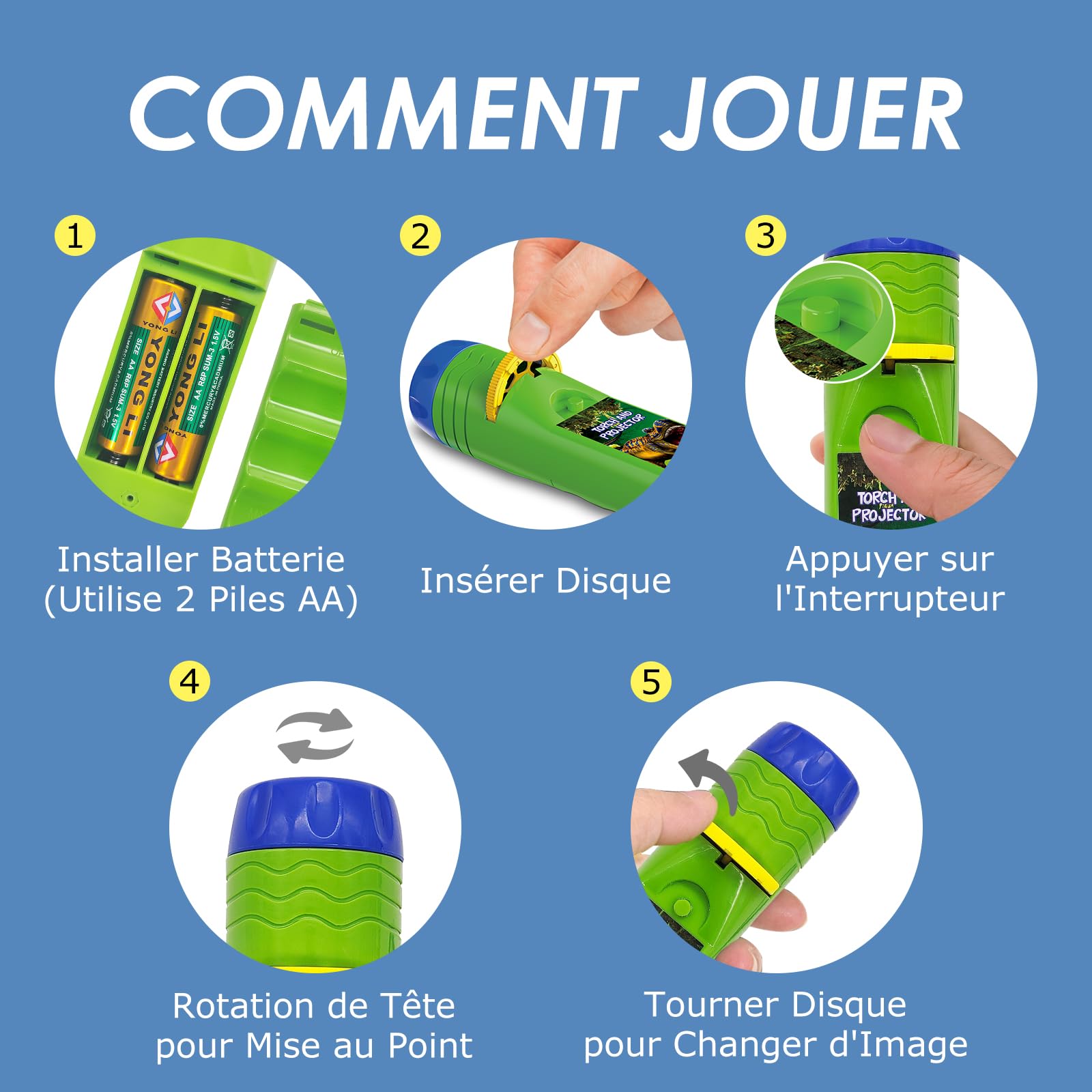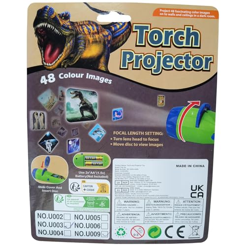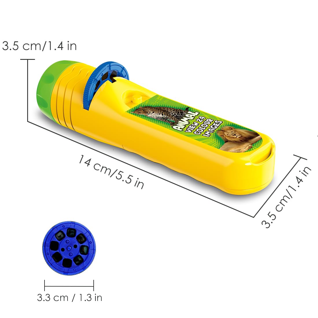 Features Fantastic Projector Torch This is a Pocket-sized torch and projector Toy for 3+ years old kids. It can project images up to one meter wide on wall and ceiling. The fantastic projector torch brings nature, sea world, dinosaur, outer space and more into your bedroom, so it is also a fun bedtime toy. Easy to Play Turn on the projector and aim it at wall or ceiling, insert the selected disc and rotate it to observe the projected image, and then just rotate the lens to adjust the sharpness to create clear and accurate image. You can adjust the distance between torch and wall to determine the size of the image. Diverse Themes Full family projector contains a lot of themes, each of which includes 24 fascinating images. Outer Space: 24 space exploration images including astronaut, space shuttle, planet and nebulae, let your kids enter the mysterious outer space world. Sea World: 24 marine animal images including dolphin, penguin, polar bear, shark, walrus, etc., let your kids enter the beautiful sea world. Dinosaur: Including 24 dinosaur images such as Tyrannosaurus, Pterosaur, Giant dragon, Triceratop, etc., let your kids enter the magical dinosaur world. Wild Animals: 24 wild animal images including tiger, wolf, lion, panda, zebra and elephant, let your child enter the world of nature. Mermaid: Including 24 little mermaid pictures, let your child enter the lovely fairy tale world. Children Love it The aim of the STEM toy is to entertain children and stimulate children's curiosity to know the world, and encourage them to explore and develop enthusiasm for these subjects. It's a great gift for early education and bedtime story. Specification Age: 3+ Material: Non-toxic ABS Plastic Battery: 2 x AA Batteries (Not Included) Torch Size: 13.5*3.5cm/5.3*1.4in Weight: 60g/0.13lb Package Include 1 x Projector Torch 3 x Slides (24 Images)