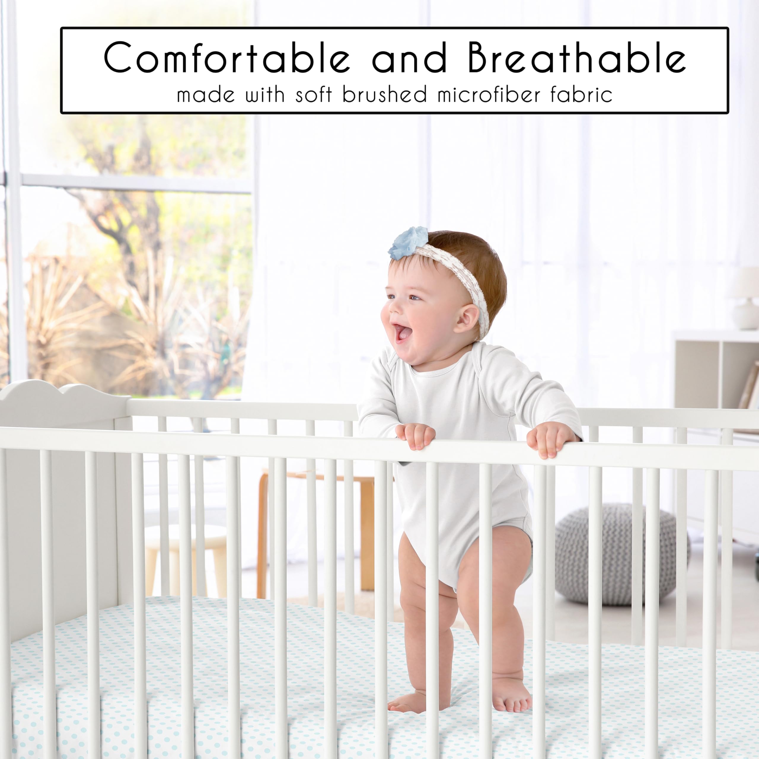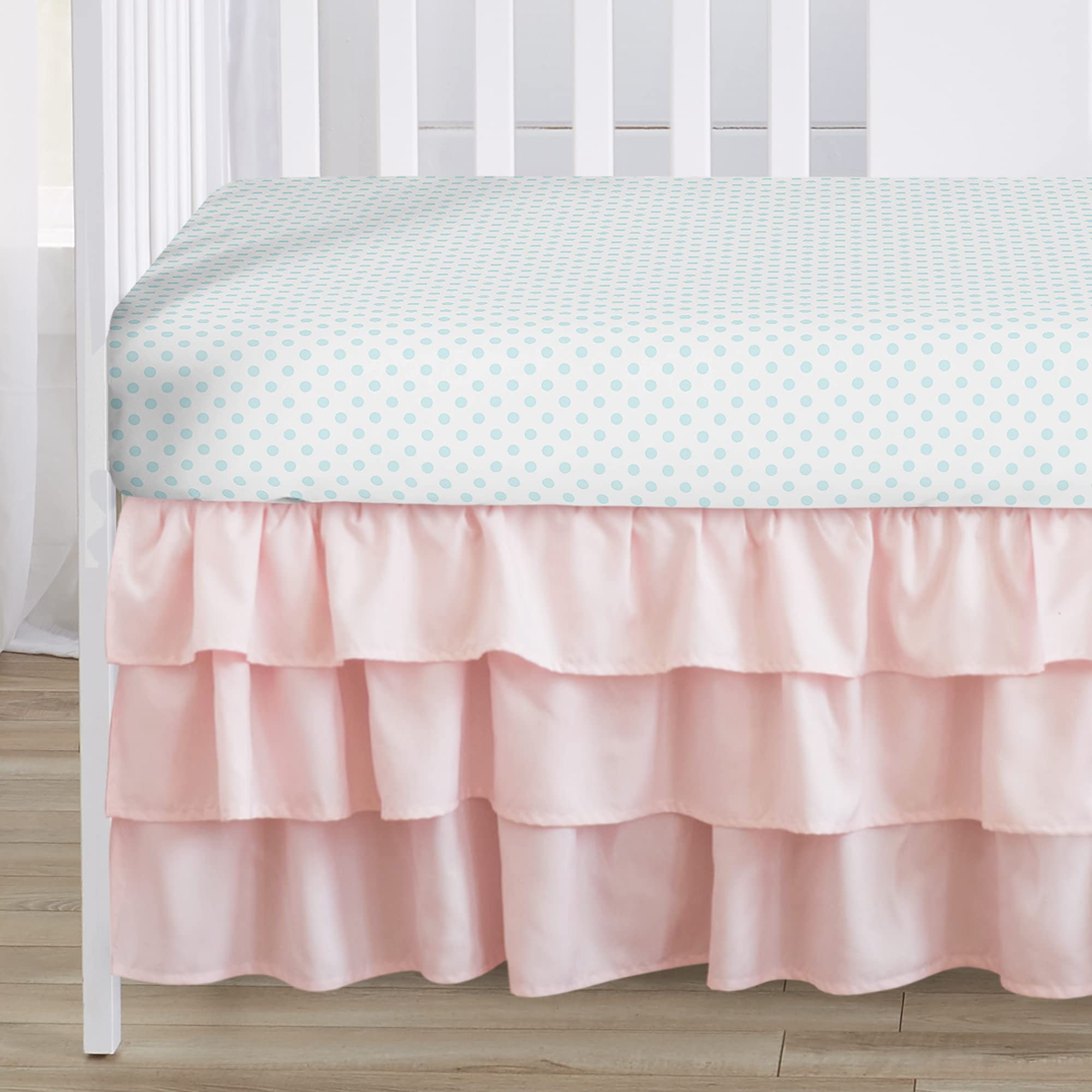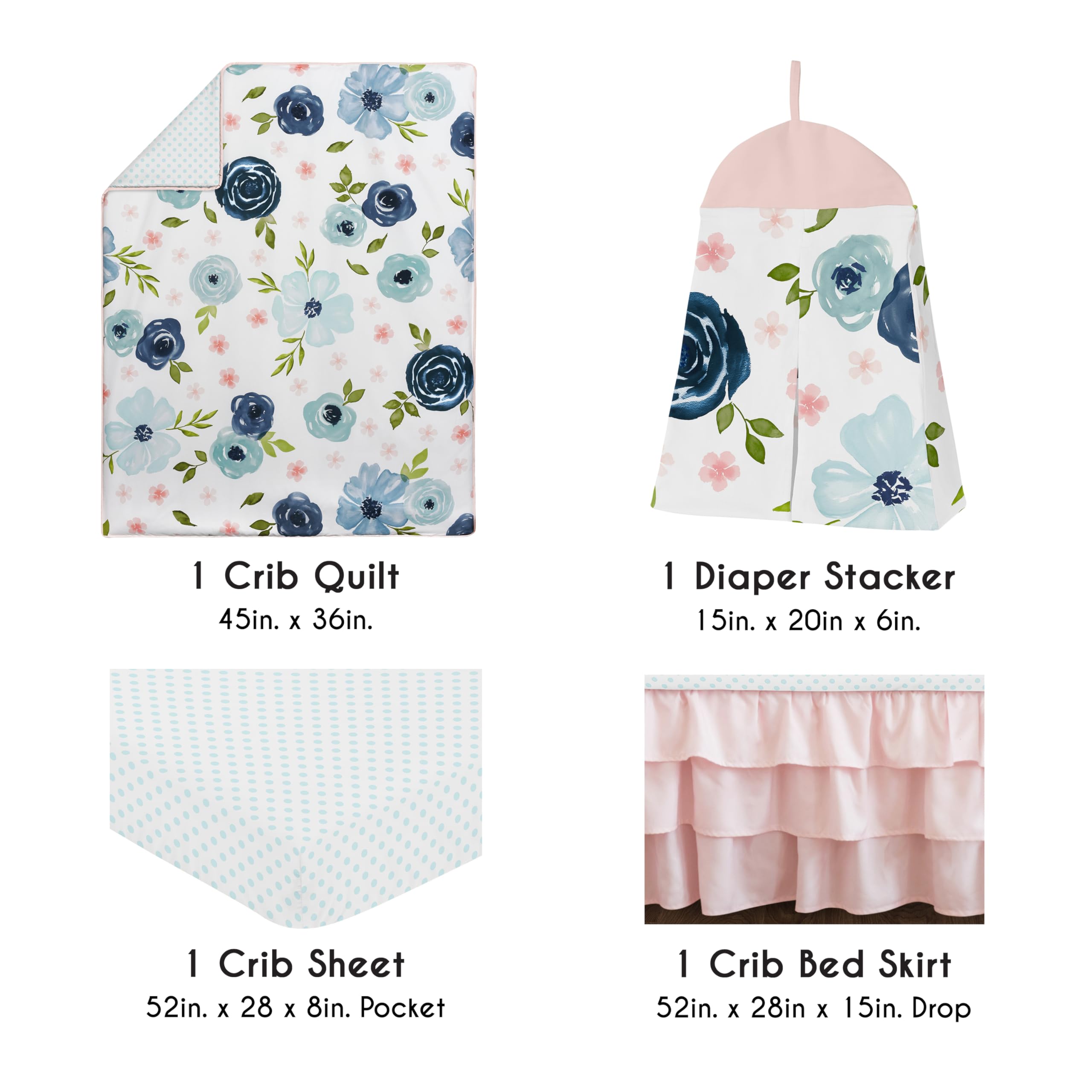 4 PIECE CRIB BEDDING SET INCLUDES: Crib Comforter (45in. x 36in.), Fitted Crib Sheet (52in. x 28in. x 8in. Pocket), Crib Skirt (52in. x 28in. x 15in. Drop) and Diaper Stacker (15in. x 20in. x 6in.). An infant crib set including all the baby essentials is a great value compared to purchasing pieces separately. This baby crib set is made of soft microfiber fabric & features a farmhouse style color palette of blush pink green white & blue that will bring your vintage boho chic baby room together.
