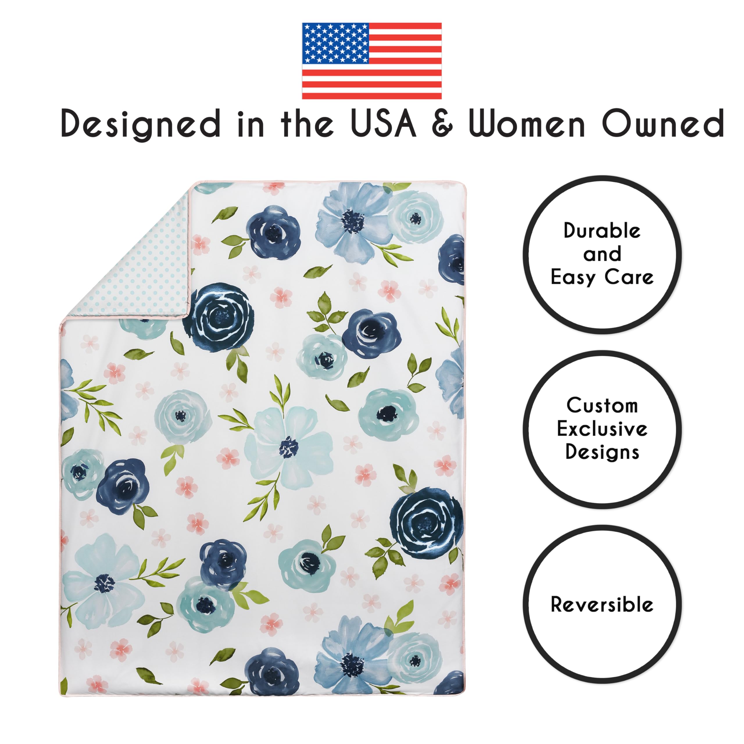 WATERCOLOR FLORAL THEME: This baby girl crib bedding set boasts a crib blanket featuring an elegant, blue rose flower, wildflower garden print that reverses to a mini blue polka dot print. The classy solid blush skirt features 3 ruffle tiered detailing. The soft and bold mini blue polka dot boho breathable crib sheet has elastic sewn around the bottom edge for a secure fit on most standard cribs. The matching diaper stacker keeps nappies conveniently organized. Machine washable. Tumble dry low.