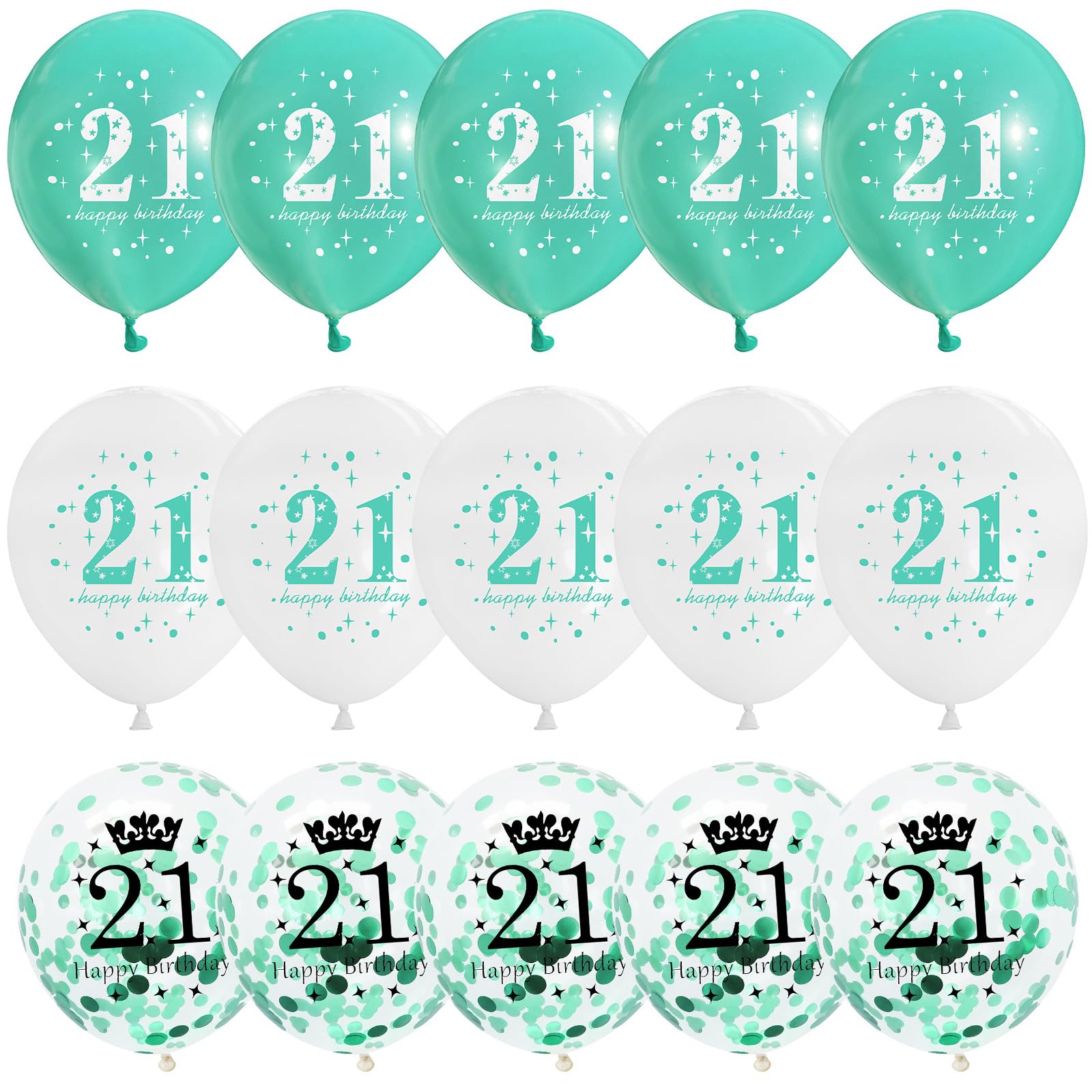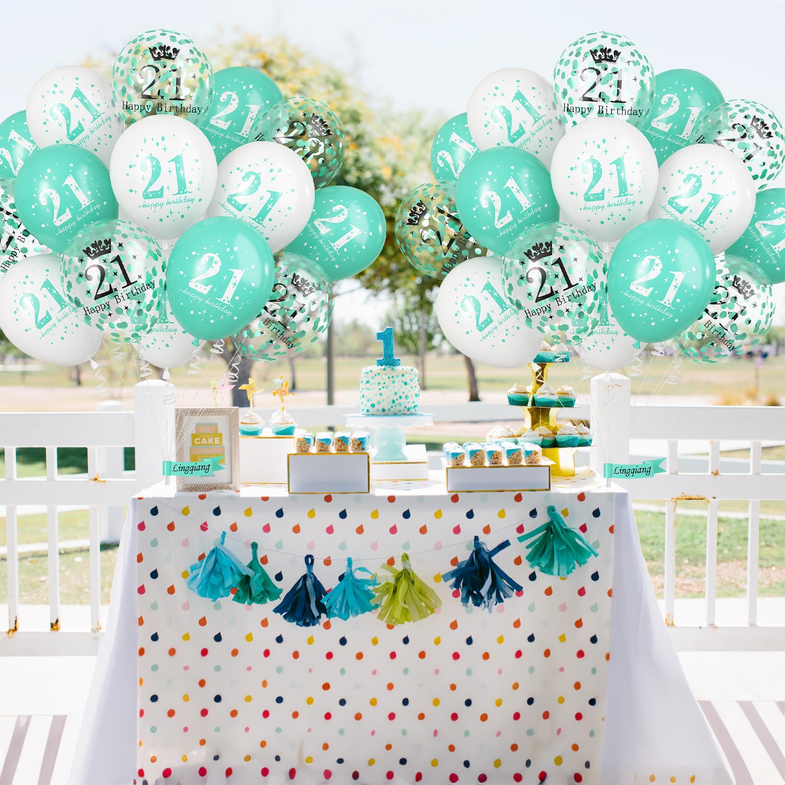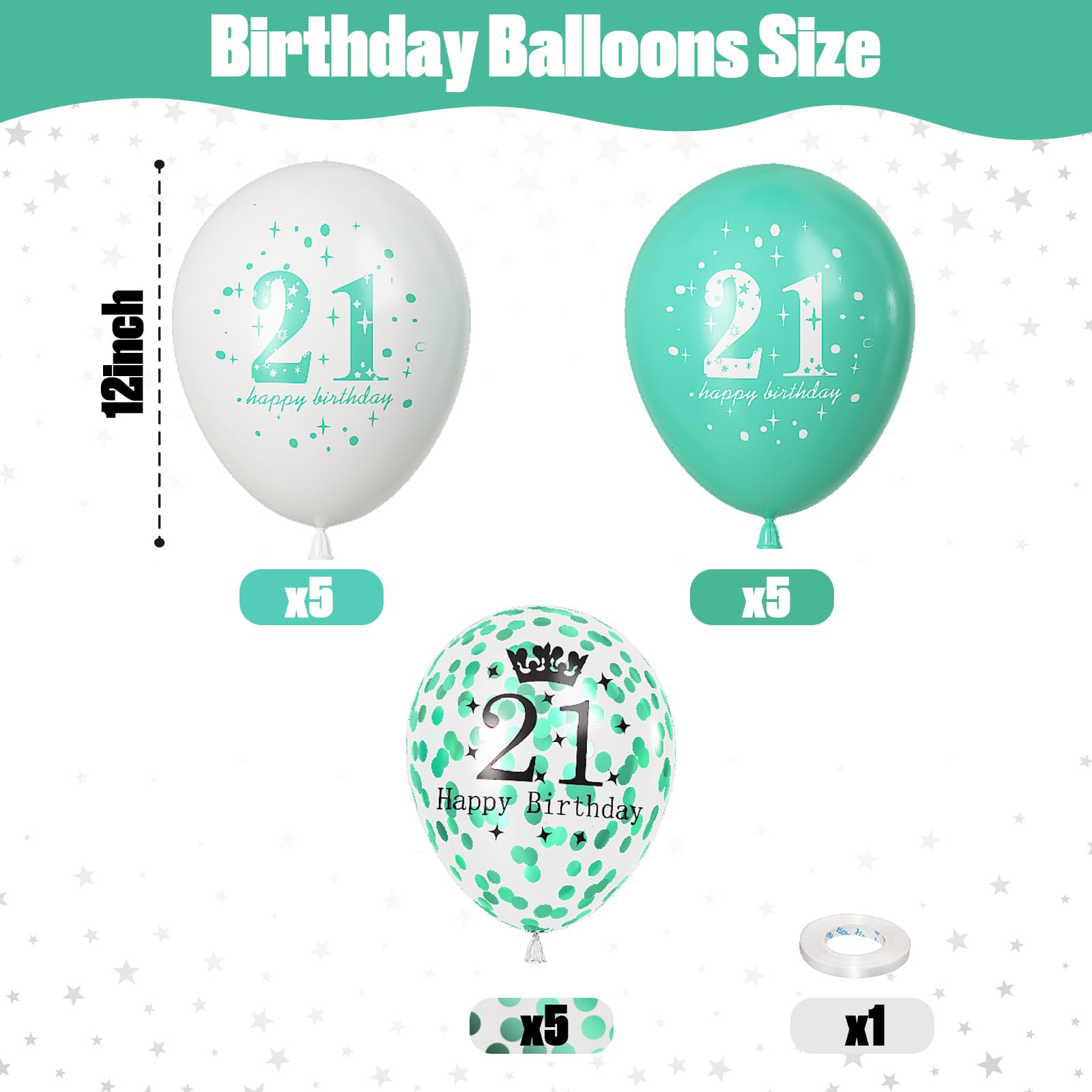 🎂 21st Birthday Balloons - You will get total 15 pieces 12 inch teal white happy 21st birthday latex balloons, inclulde 5 pcs turquoise print balloons, 5 pcs white print balloons, 5 pcs teal confetti print balloons, come with a balloon ribbon. Perfect for her girls boys 21st birthday party decorations supplies.