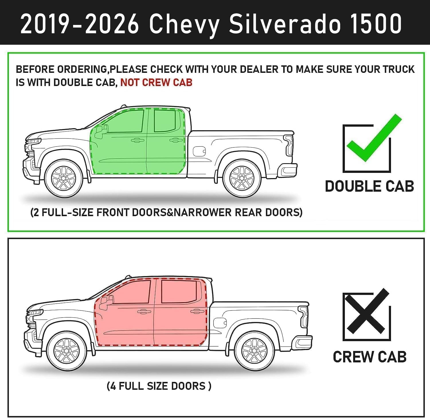 FITMENT: Truck running boards compatible with 2019-2026 chevy silverado/gmc sierra 1500 double cab, 2020-2025 silverado/gmc sierra 2500hd 3500hd double cab wtih 2 narrow rear doors. Not compatible with crew cab with 4 full-size doors. Does not fit 2019 silverado/sierra 1500 ld/litimted. Does not fit diesel model.