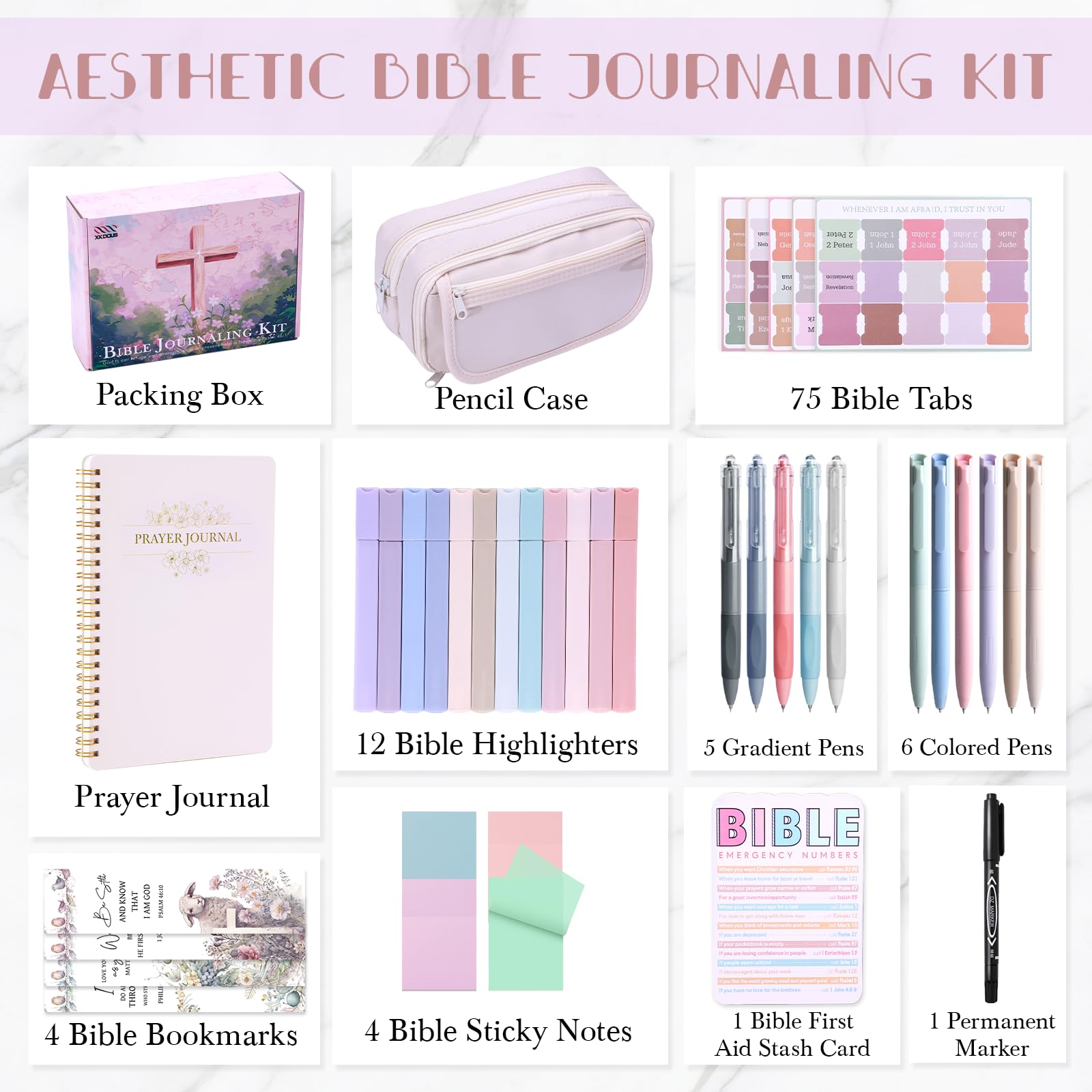 You Will Get: 1 exquisite pencil case, 1 prayer journal, 12 aesthetic bible highlighters, 5 gradient gel pens, 6 multi-color pens, 75 bible tabs, 4 transparent sticky notes, 4 bible bookmarks,1 bible first aid stash card and more