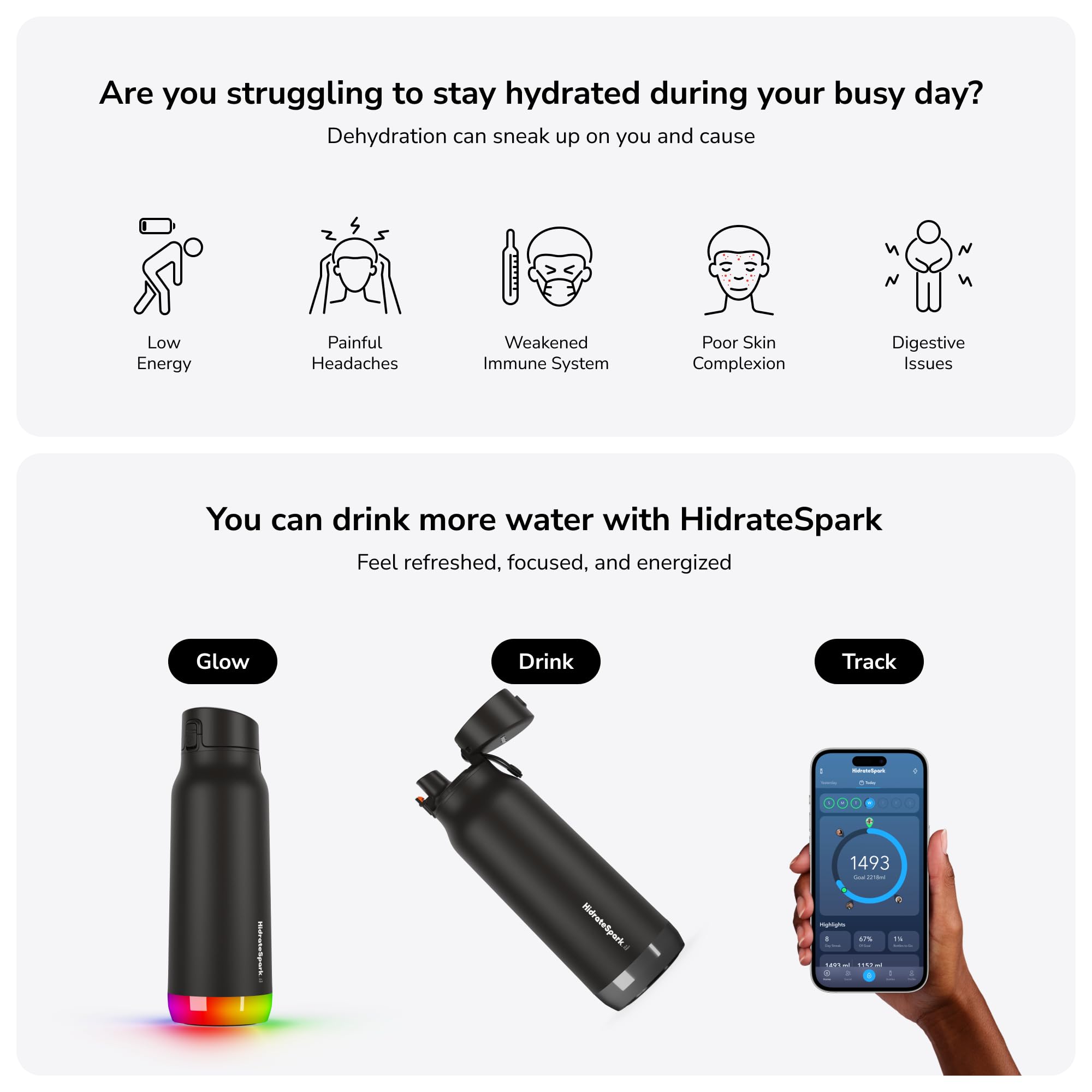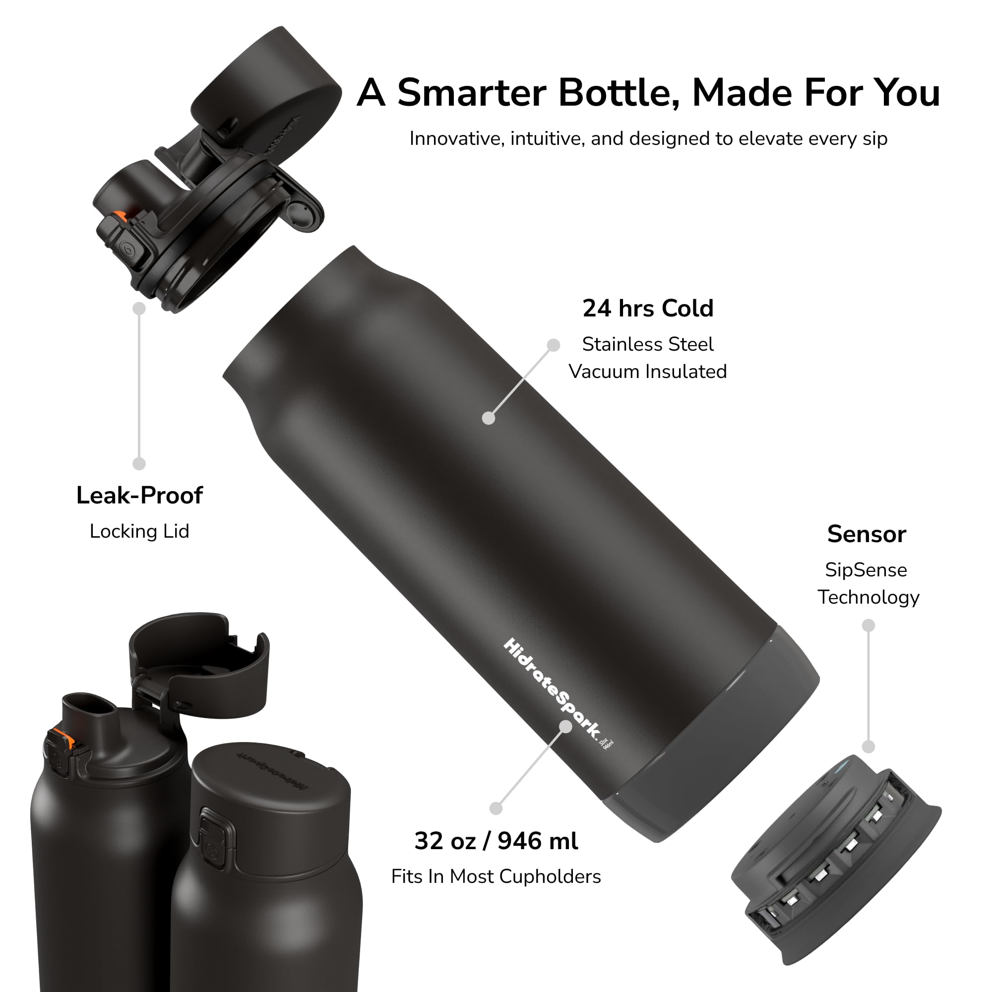 Hidrate Spark PRO Smart Water Bottle – Insulated Stainless Steel – Tracks Water Intake with Bluetooth, LED Glow Reminder When You Need to Drink – Chug Lid, 32oz, Black