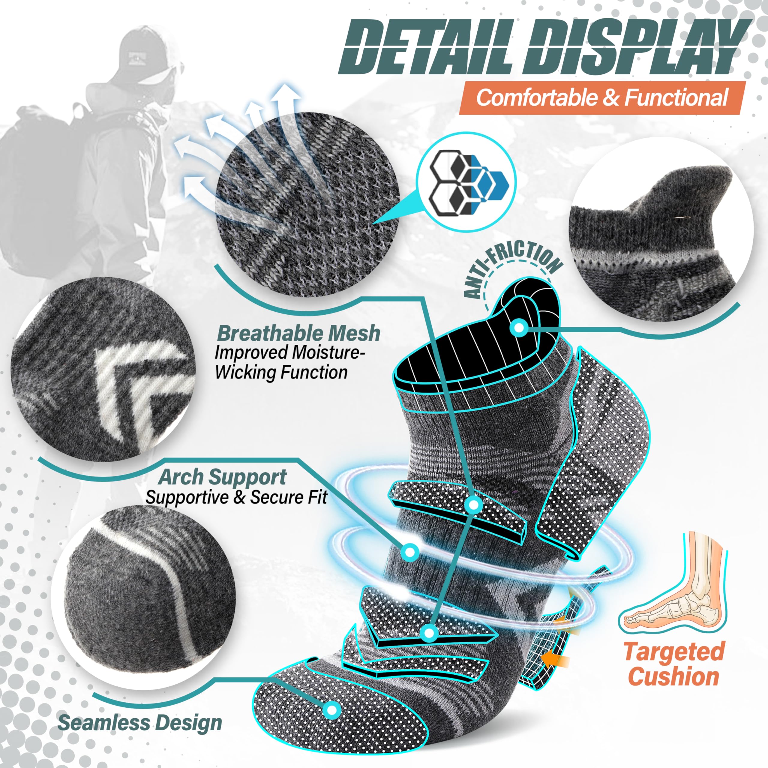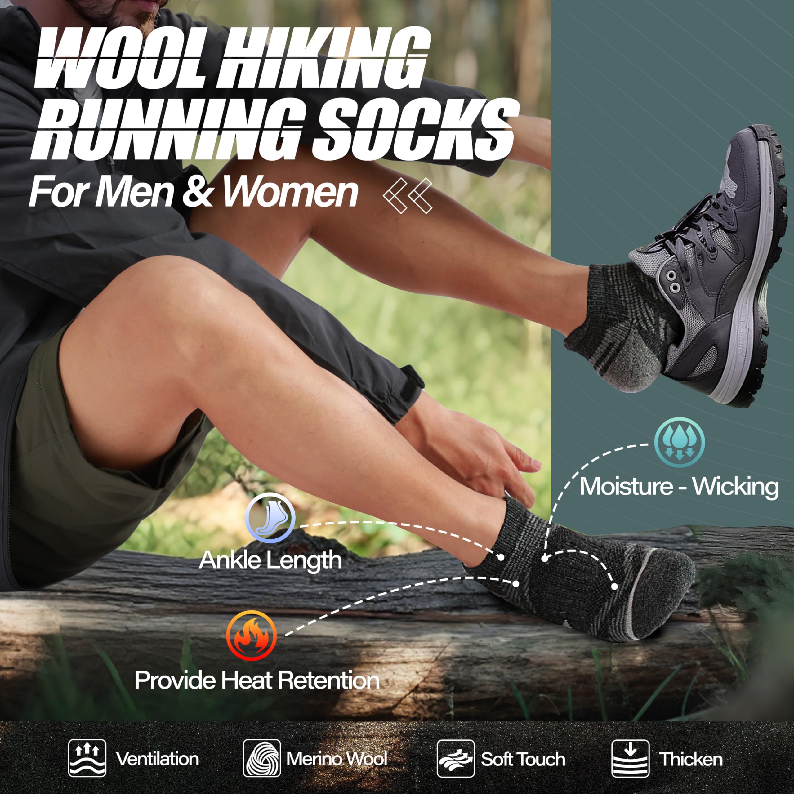 š GENTLE COMPRESSION SUPPORT ļ¼The hiking wool ankle socks incorporates a gentle compression support technology, and a compression stripe is designed on the ankle and the arch , so that the socks can protect achilles and keep the socks in place,It can also enhance blood circulation , relieve symptoms varicose , reduce fatigue and help in muscle recovery. They are perfect socks for hiking , climbing , running , walking or other outdoor activities.