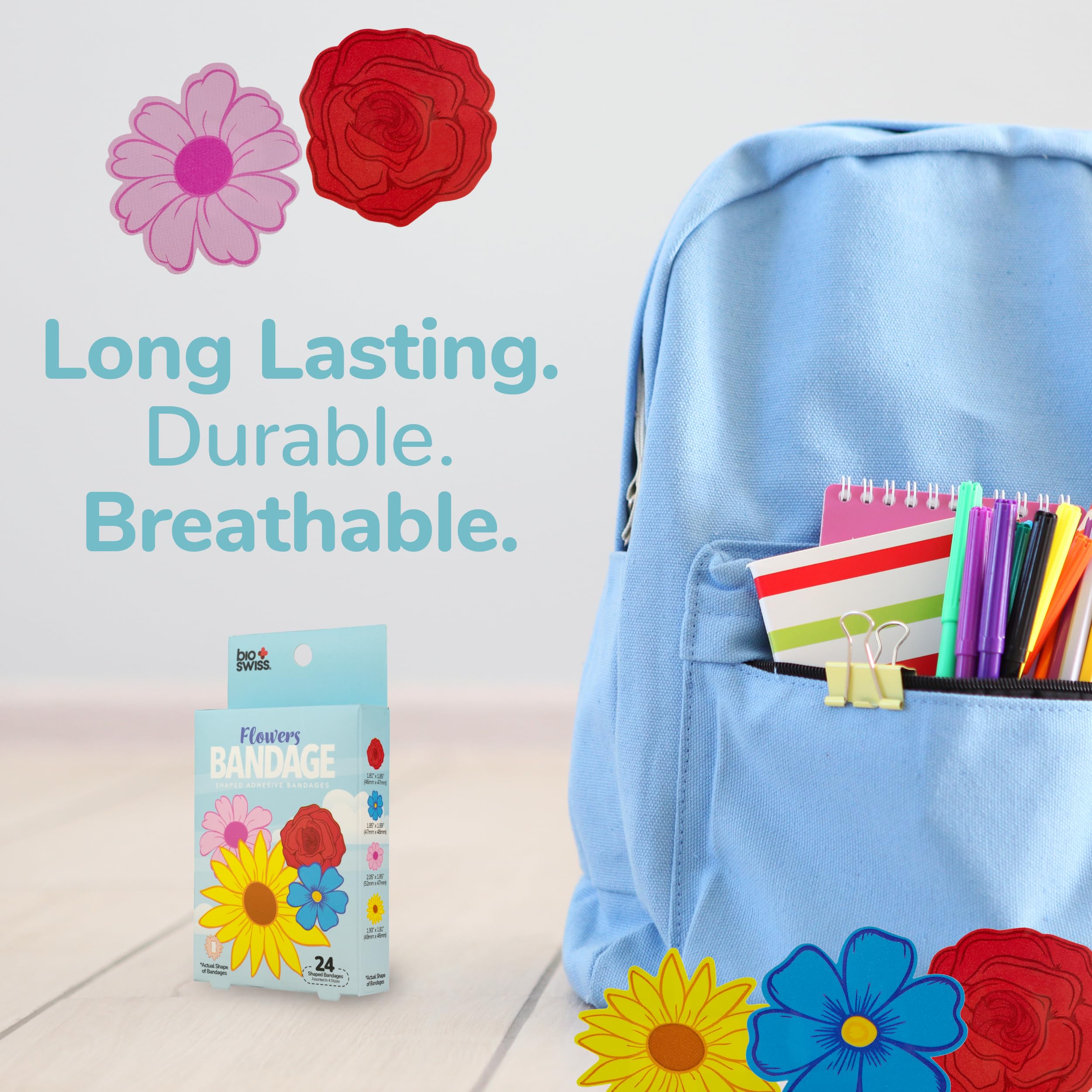 FLOWER BANDAGES: This 24 piece pack of Flowers bandages feature fun red rose, yellow sunflower, blue Forget-Me-Not, and pink petunia flower shapes, and is great for putting a smile on kids' faces while protecting wounds such as cuts, scrapes, and burns; sticky bandages come in a cute cardboard box and are perfect for kids and adults alike, and also for school nurses and pediatric doctors