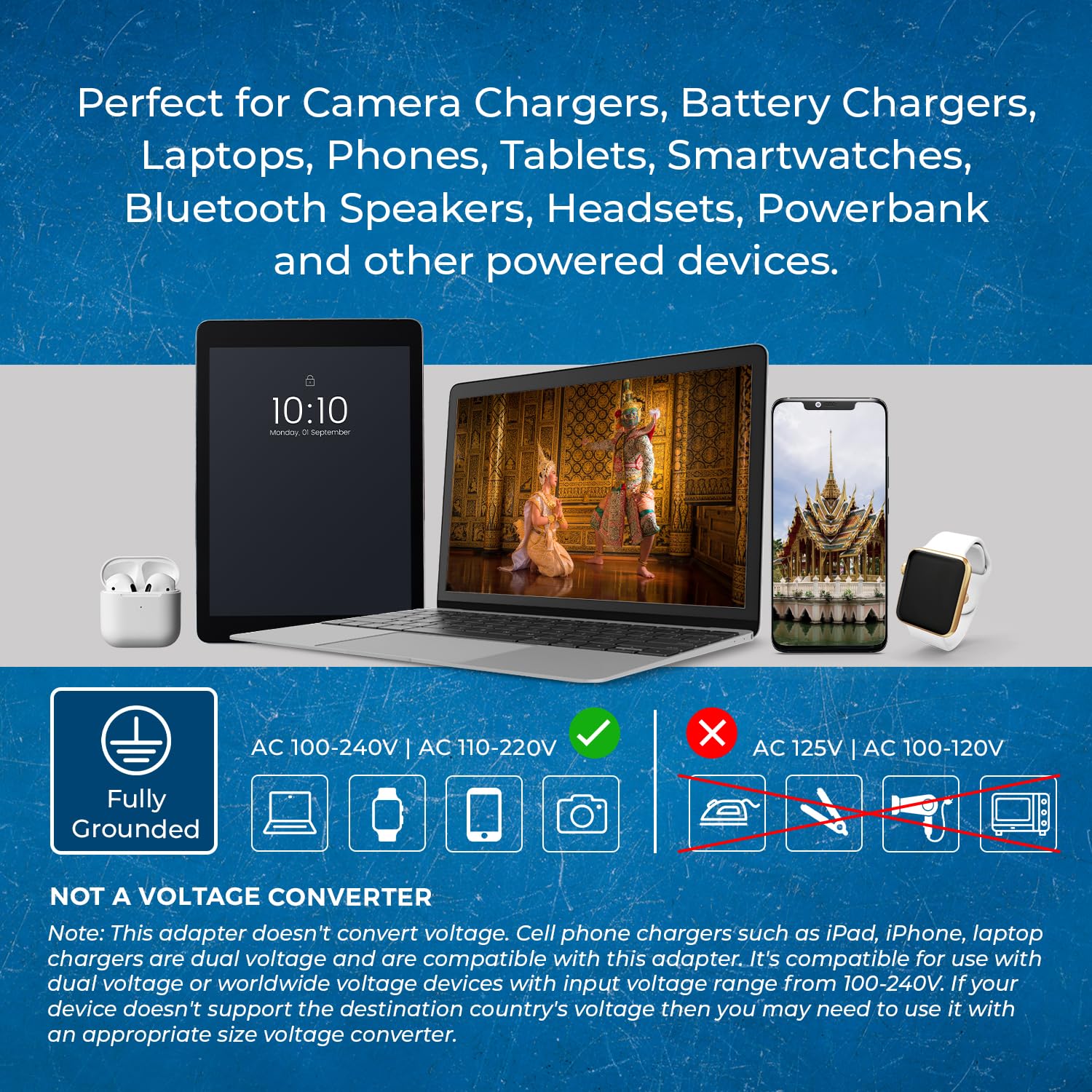 Important: This is just a travel adapter, it will not work with devices that require a voltage converter. It will only work with dual voltage products such as cell phones, chargers, & laptops etc.