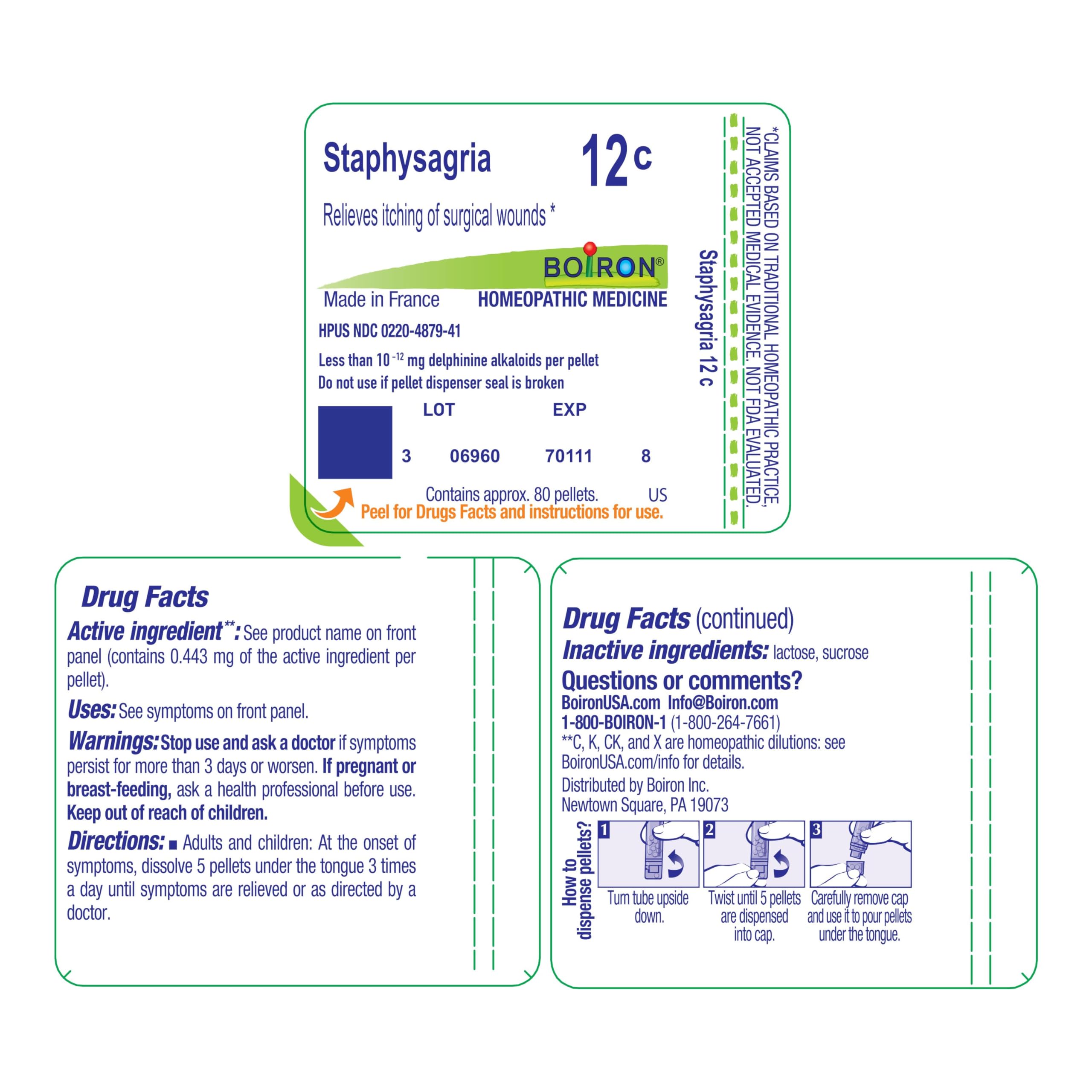 Customize your care with Boiron single medicines for highly targeted relief. Staphysagria is a homeopathic medicine that relieves itching of surgical wounds. The pellets melt in your mouth and can be taken on the go, no food or water needed. They come in an easy dispensing tube of approx. 80 pellets (16 doses). Boiron single medicines are ideal for adults and children and do not contain artificial colors, flavors, sweeteners, or preservatives. Always use according to the label instructions unless directed by your health care professional. With more than 85 years of expertise, Boiron is a trusted brand that prides itself on quality manufacturing and responsible environmental practices. All products are made according to the highest standards of cGMP and formulated with HPUS ingredients for purity.