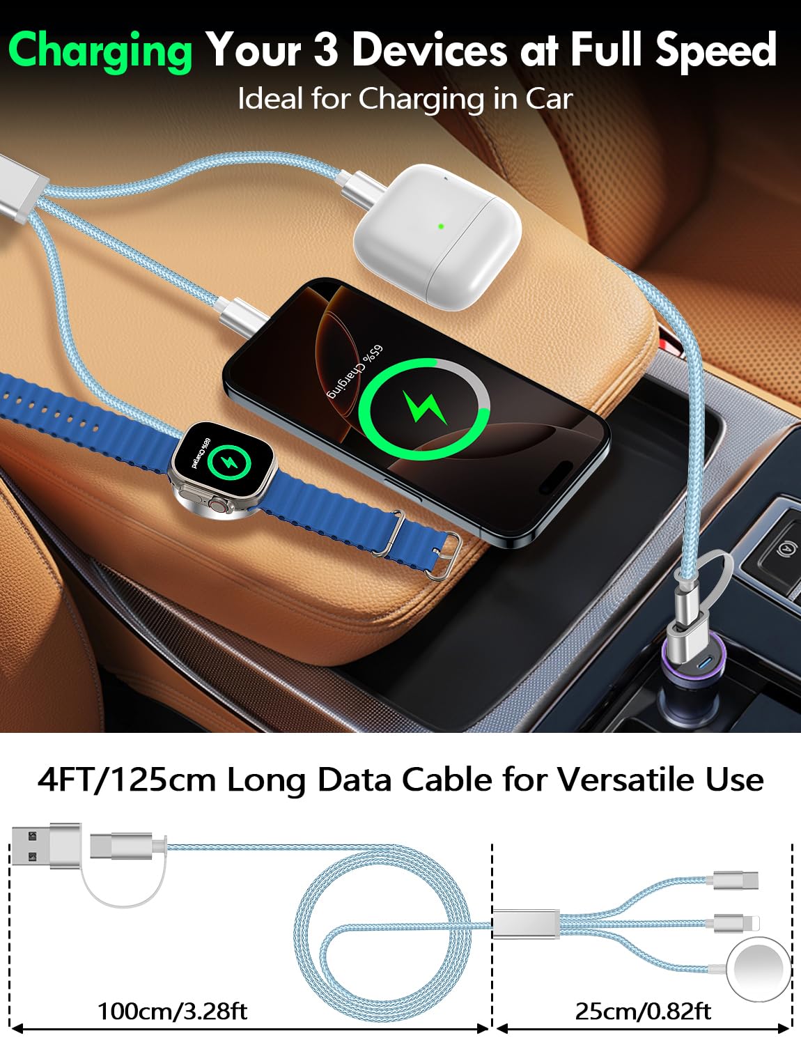 【Portable Travel Camping Essentials&Car accessories】This 1.25M/4ft 3 in 2 charging cable is convenient to carry around with lightweight and portable design.It fits seamlessly into travel vocation essentials like bags and suitcases so it is a perfect choice when going on holiday,business trip,travel,office,dorm life,apartment living, college campuses,and hiking adventures. Ideal for charging in car,Charge iPhone, iWatch, and USB A to C cable-compatible devices simultaneously—no adapters needed.