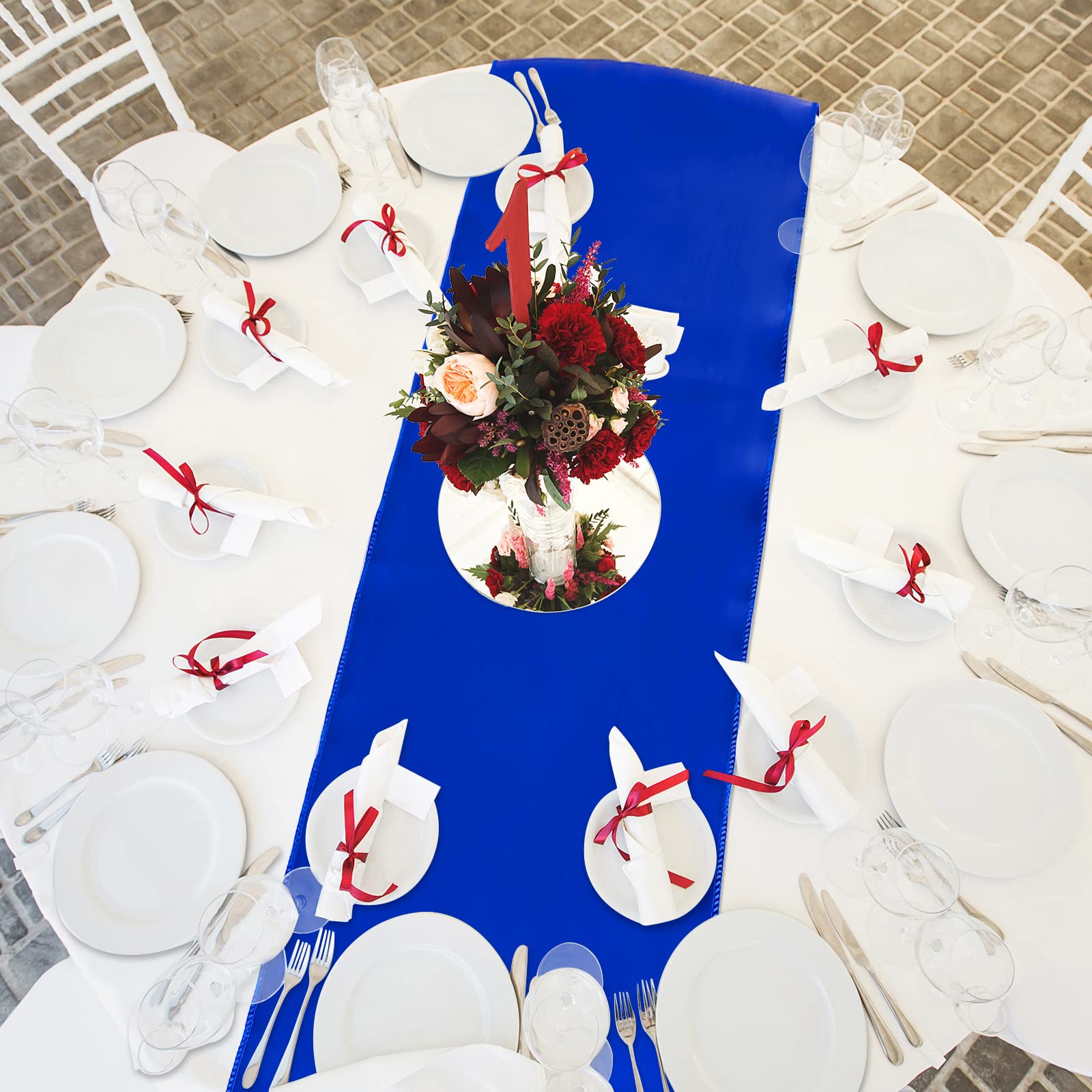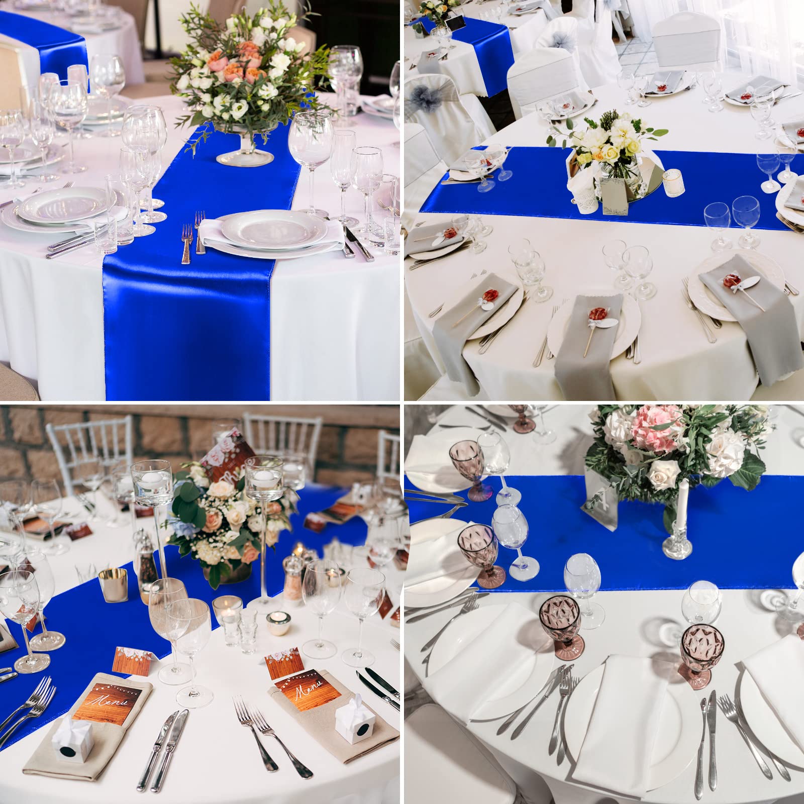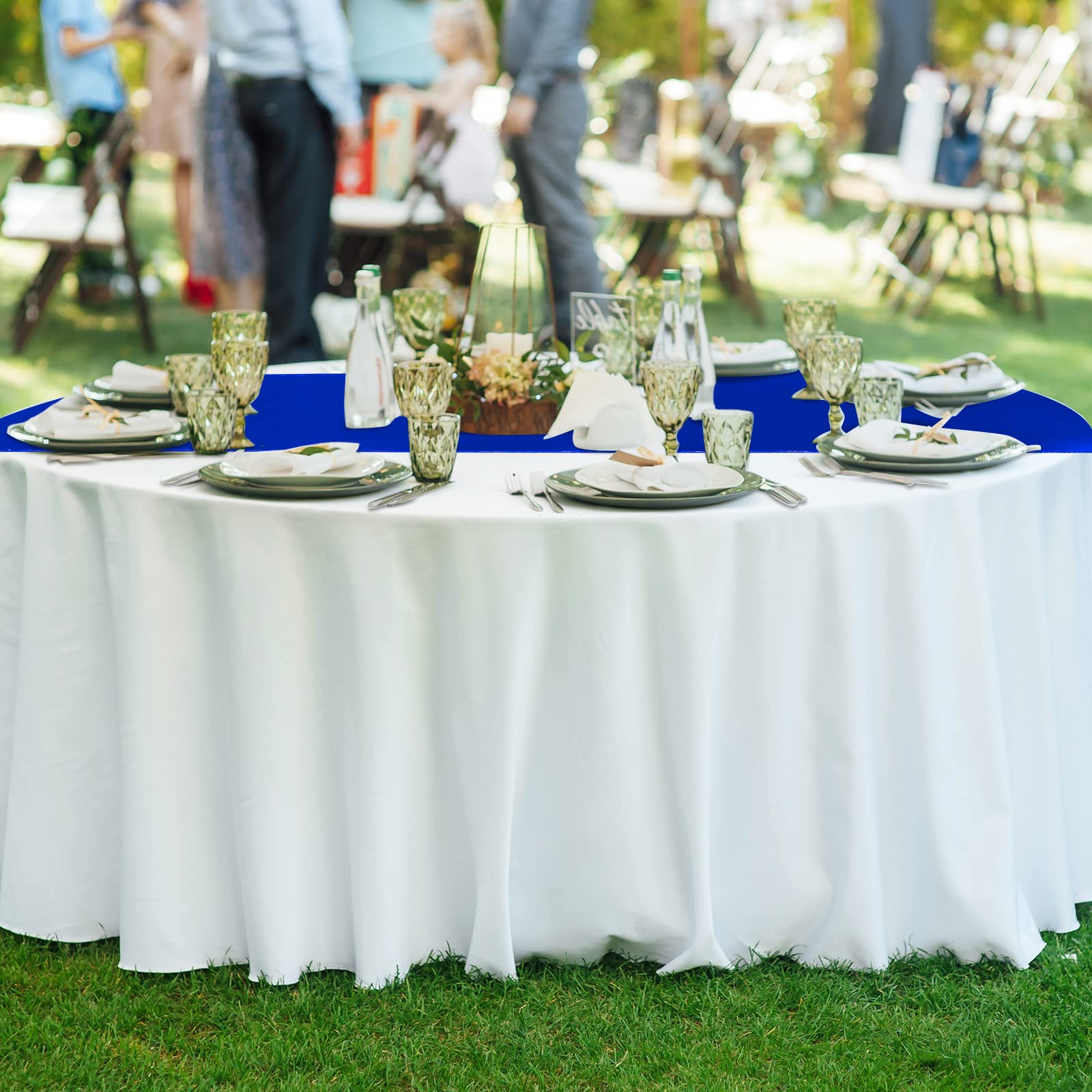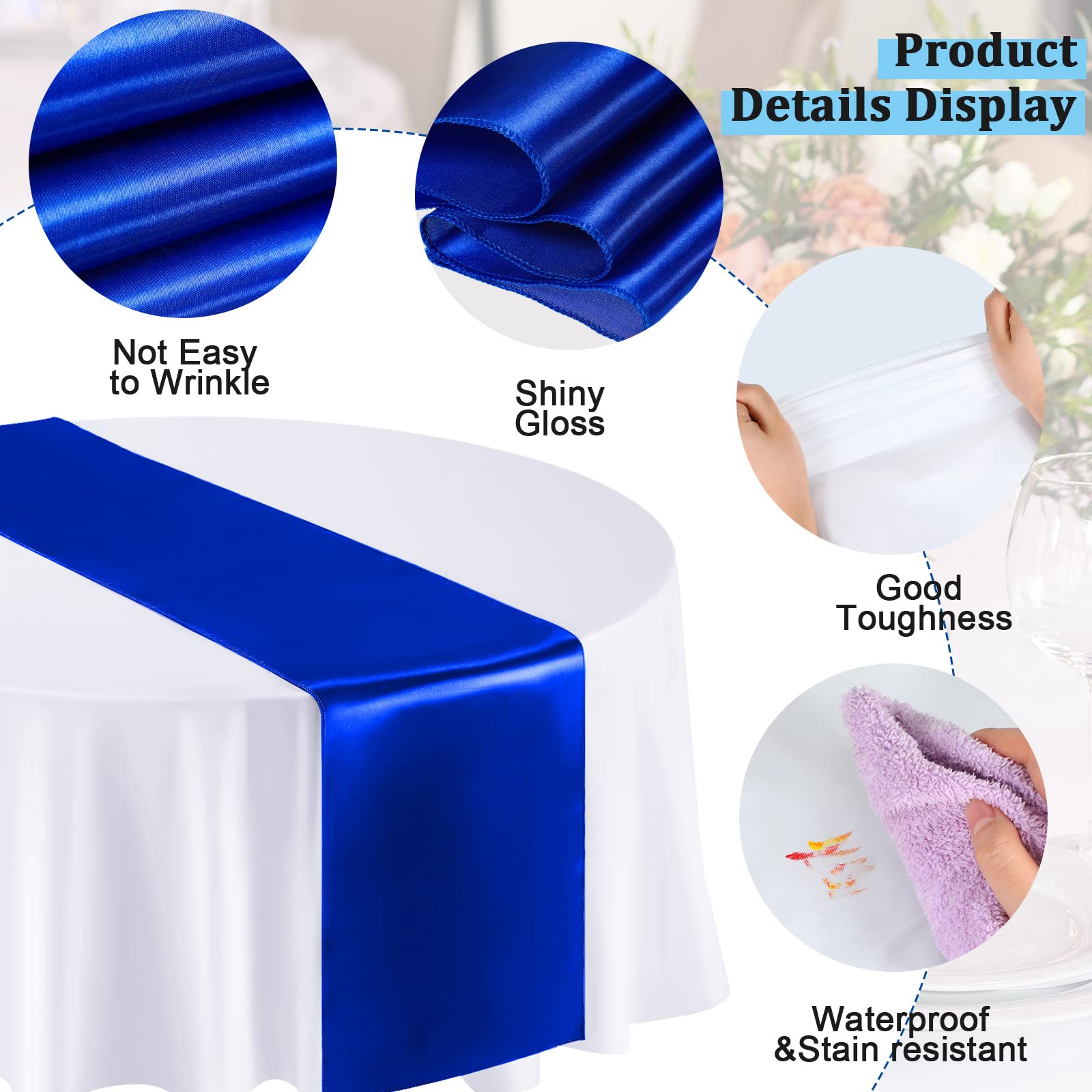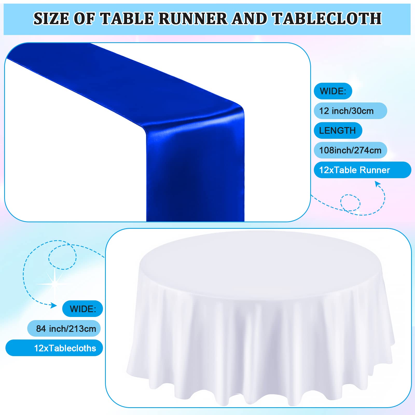 Sized to Fit Most Tables: Each royal blue satin runner measures 12 x 108 inches, ideal for most rectangular and round tables. The 84-inch round white tablecloths offer full coverage for family tables, buffet tables, or banquet setups