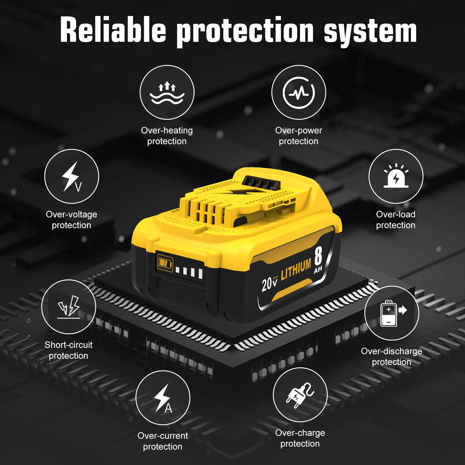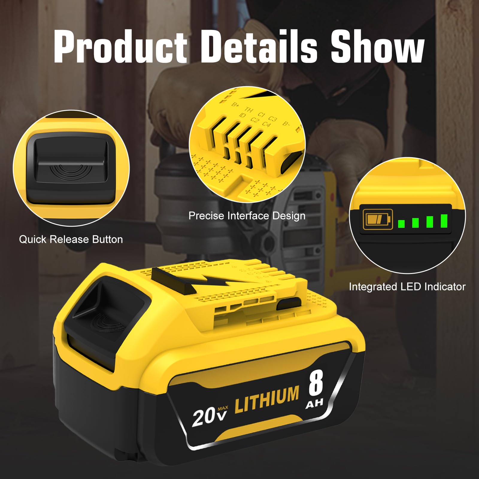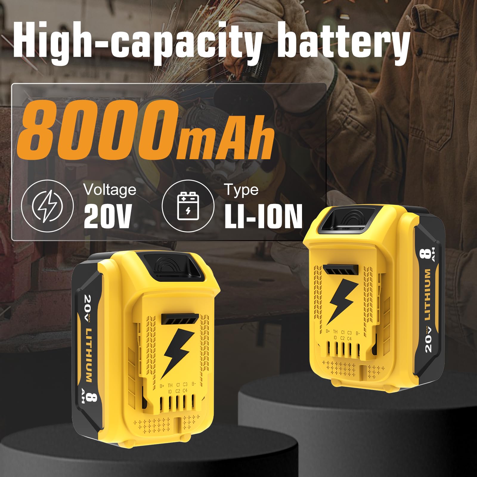 【Battery Feature】Battery type: Li-ion | Capacity:8.0Ah | Voltage: 20v, |Quantity:2Pack | LED Indicator;High capacity Professional Replacement Battery for Dewalt 20v DCD/DCF/DCG Series cordless tools