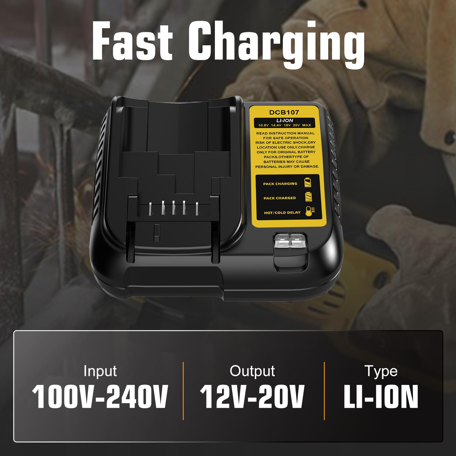 【Charger Specification】United States standard plug AC; Input: AC100-240V 1.5A; Output: 10.8V-20V Max 3.0A 32.4-60W; Replacement for Dewalt DCB107 Battery Charger