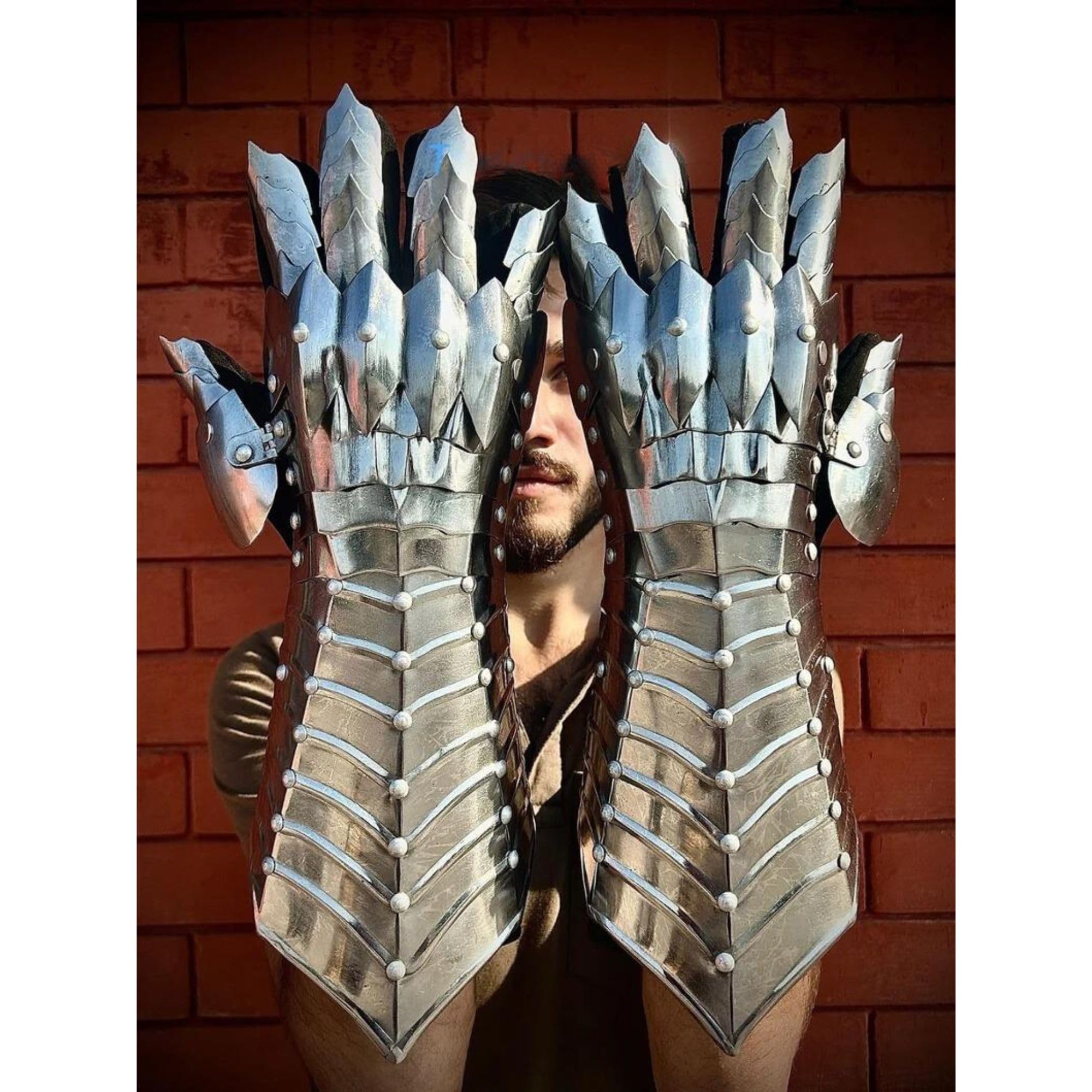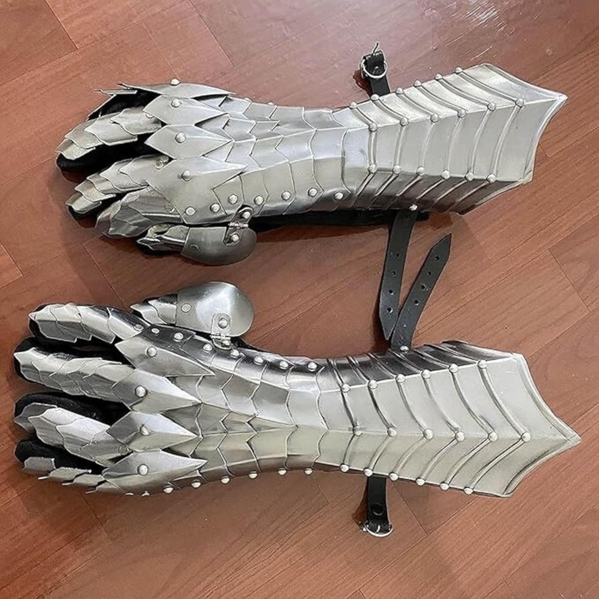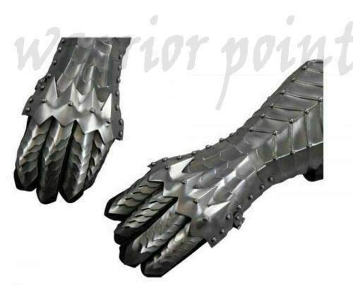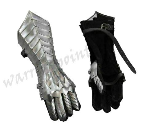 Description Inspired from the Nazgul medieval armor gauntlets.These Medieval armor gauntlets are fully articulated and simply the best gauntlets we have ever offered. These gothic gauntlets are fully articulated and strapped with a pair of high grade Silver suede gloves.The adjustable leather straps allow a perfect fit, letting you Custom size armor