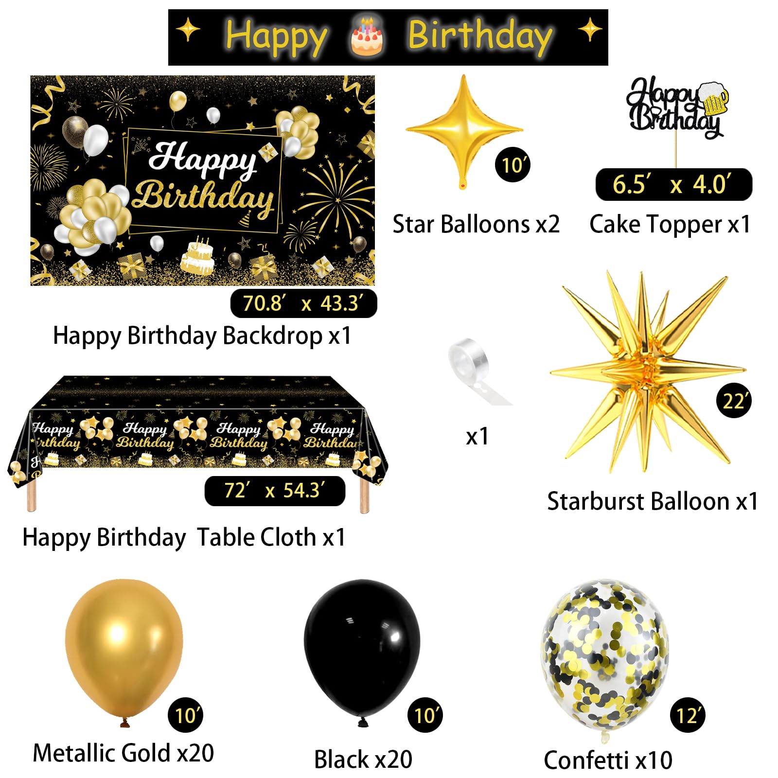 What You Will Receive: Birthday Decorations include 70.8x43.3in ‘happy birthday’ backdrop *1pcs, 72x54.3in tablecloth *1pcs, 6.5in cake topper *1pcs, 22in explosion star balloon *1pcs, 10in star balloon *2pcs, 10in metallic gold balloons *20pcs, 10in black balloons *20pcs, 12in black and gold confetti balloons *10pcs, balloon tool *1pcs.