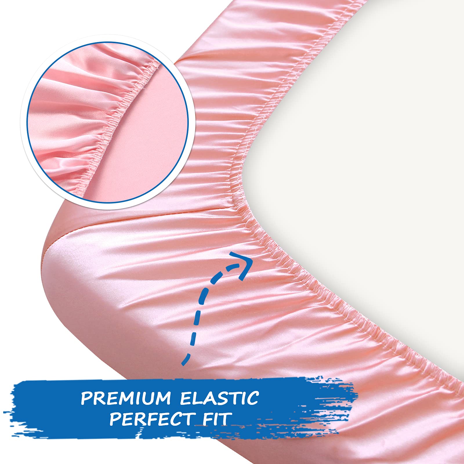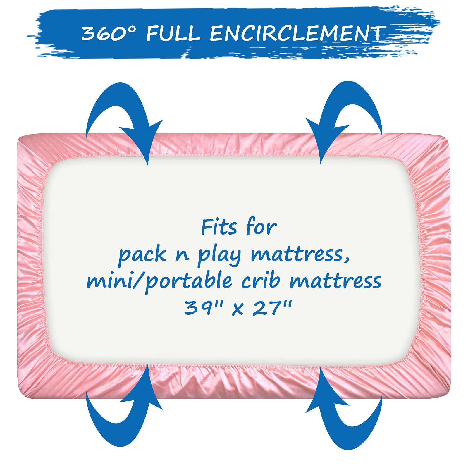Not Only Fitted, But Snug: 39"x27"x5". This satin playard sheet can snug fit your pack and play or potable playard mattress no loose but flat which gives your baby a comfortable playground. Also fit for a mini crib mattress. Each satin pack and play sheet comes with an elastic band encased at the bottom for safety. Coldwind pack and play sheets could combine the shine, thickness, softness, and durability together.