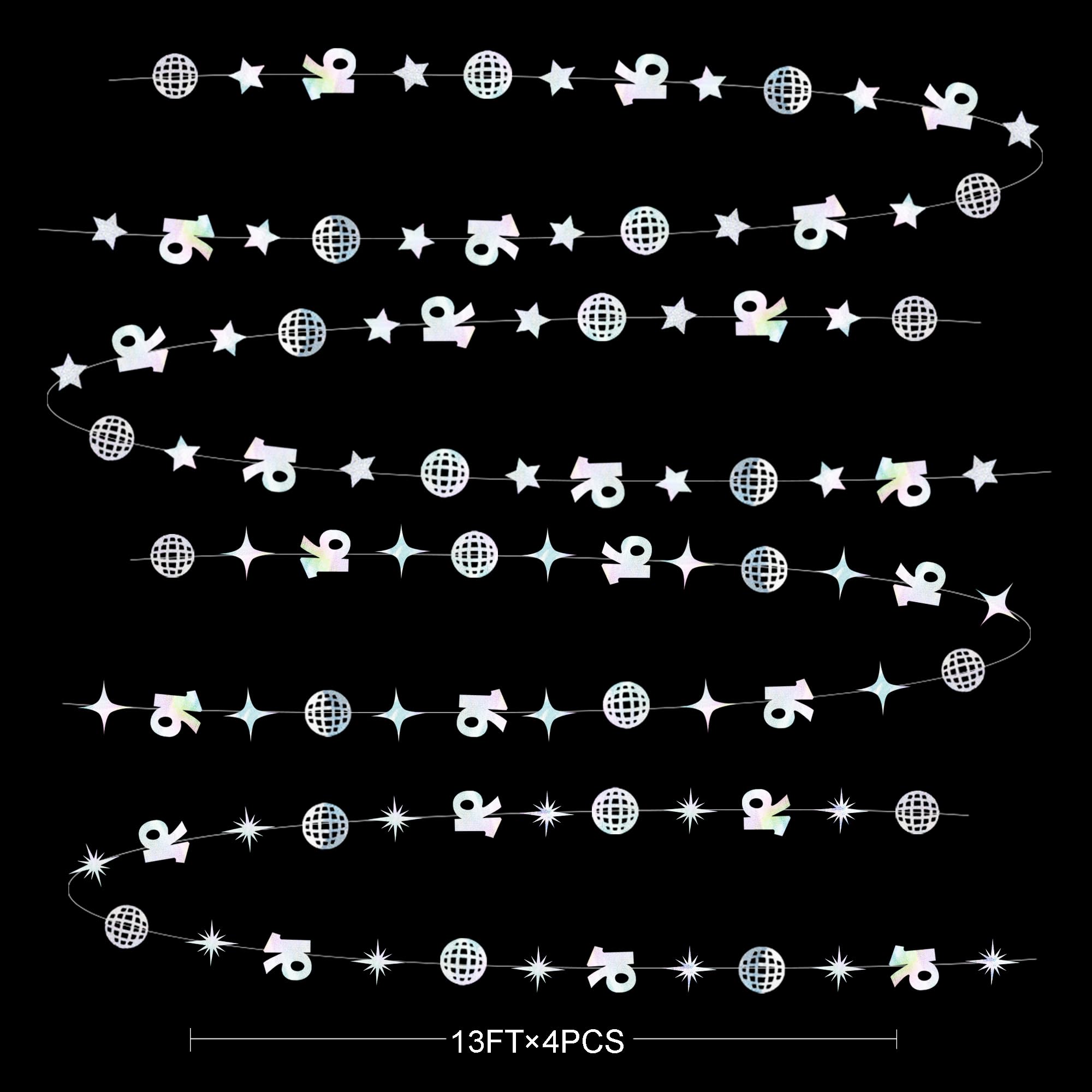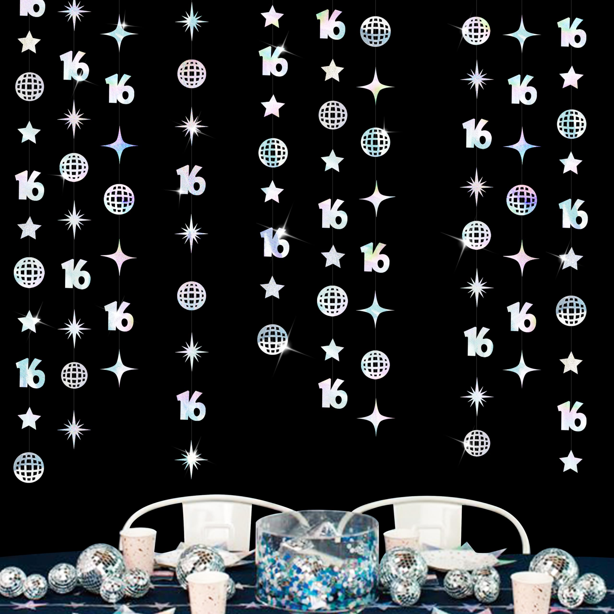 Package includes: 4 strings of 13 feet/4 meters laser iridescent disco ball and number 16 sparkling twinkle star garlands , totally is 52 feet/16 meters.