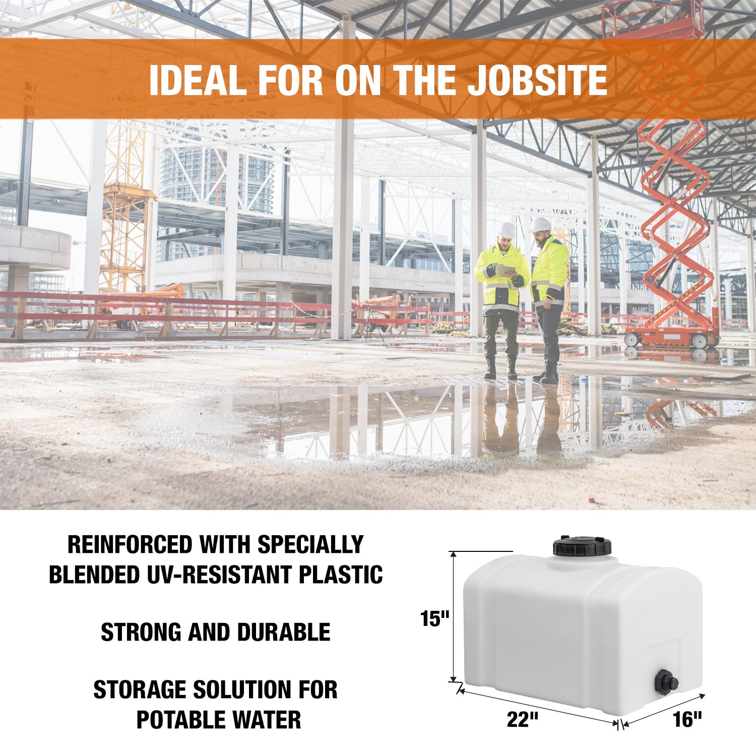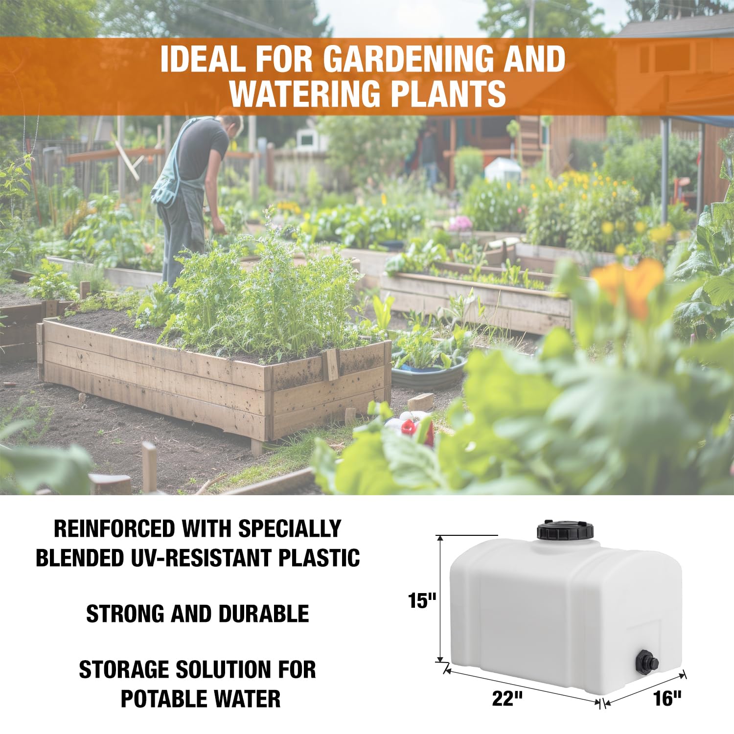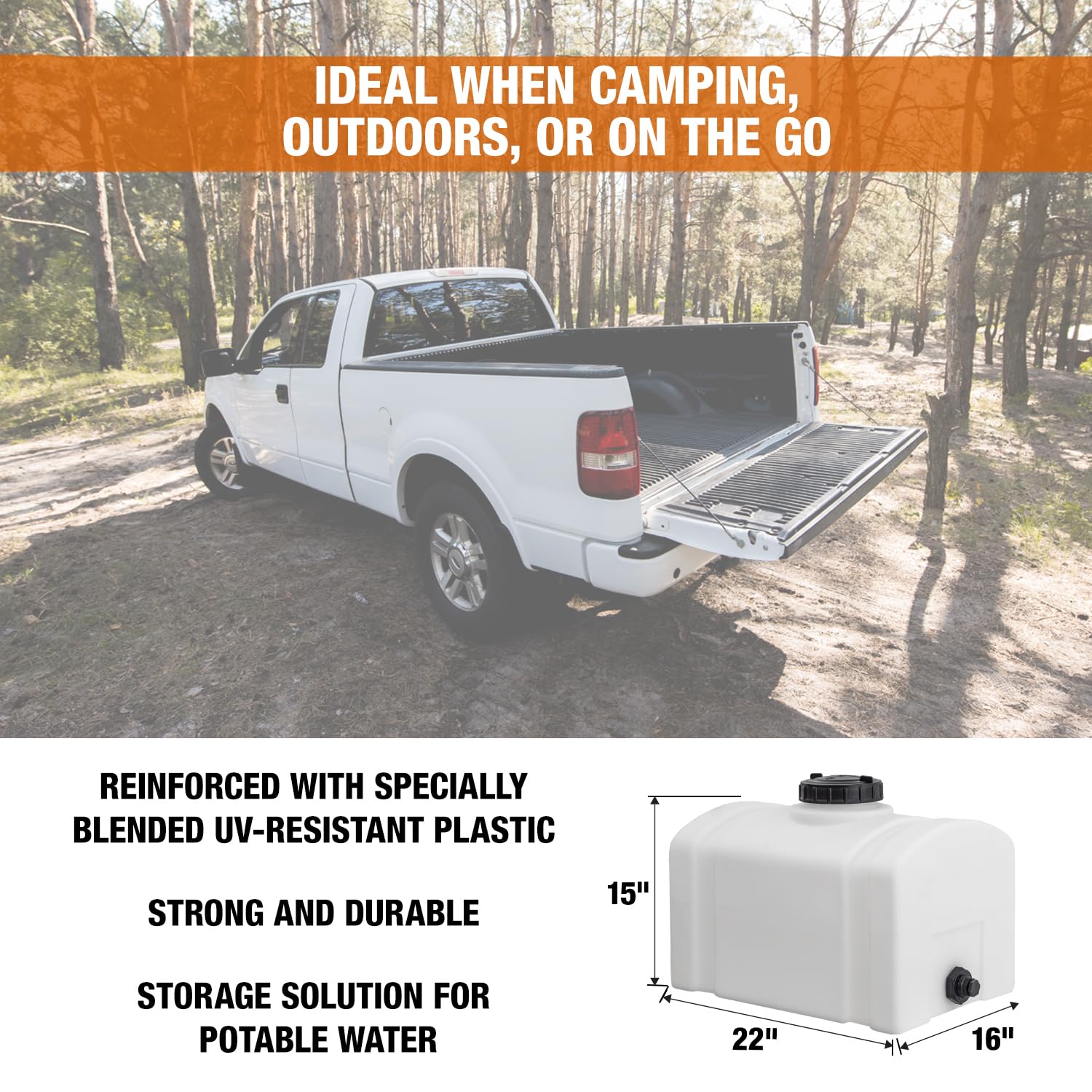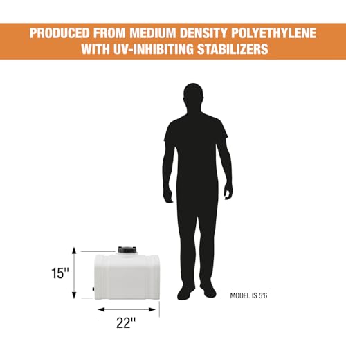 MADE IN USA, SPEC'D FOR TOUGH JOBS — For non‑flammable liquids up to 140°F contact temp; easy‑clean plastic water tank with 16‑gal capacity and 3/4" NPT outlet—reliable as an RV water tank for camping, agriculture, or industrial tasks.