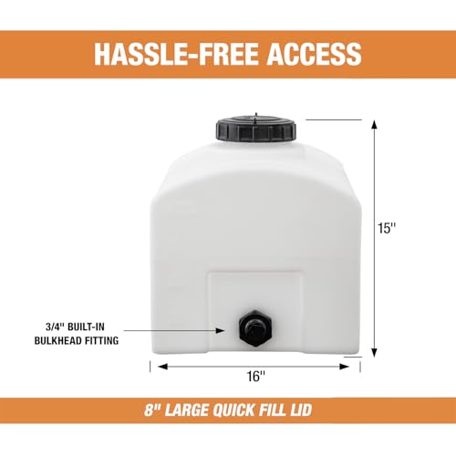 EASY FILL & DRAIN HARDWARE — Oversized 5‑1/2" lid (5" opening), easy‑tighten cap, and built‑in bulkhead fitting with 3/4" NPT outlet speed refills, siphoning, and hose hookups—ideal as a portable water tank or water tank for pressure washer.