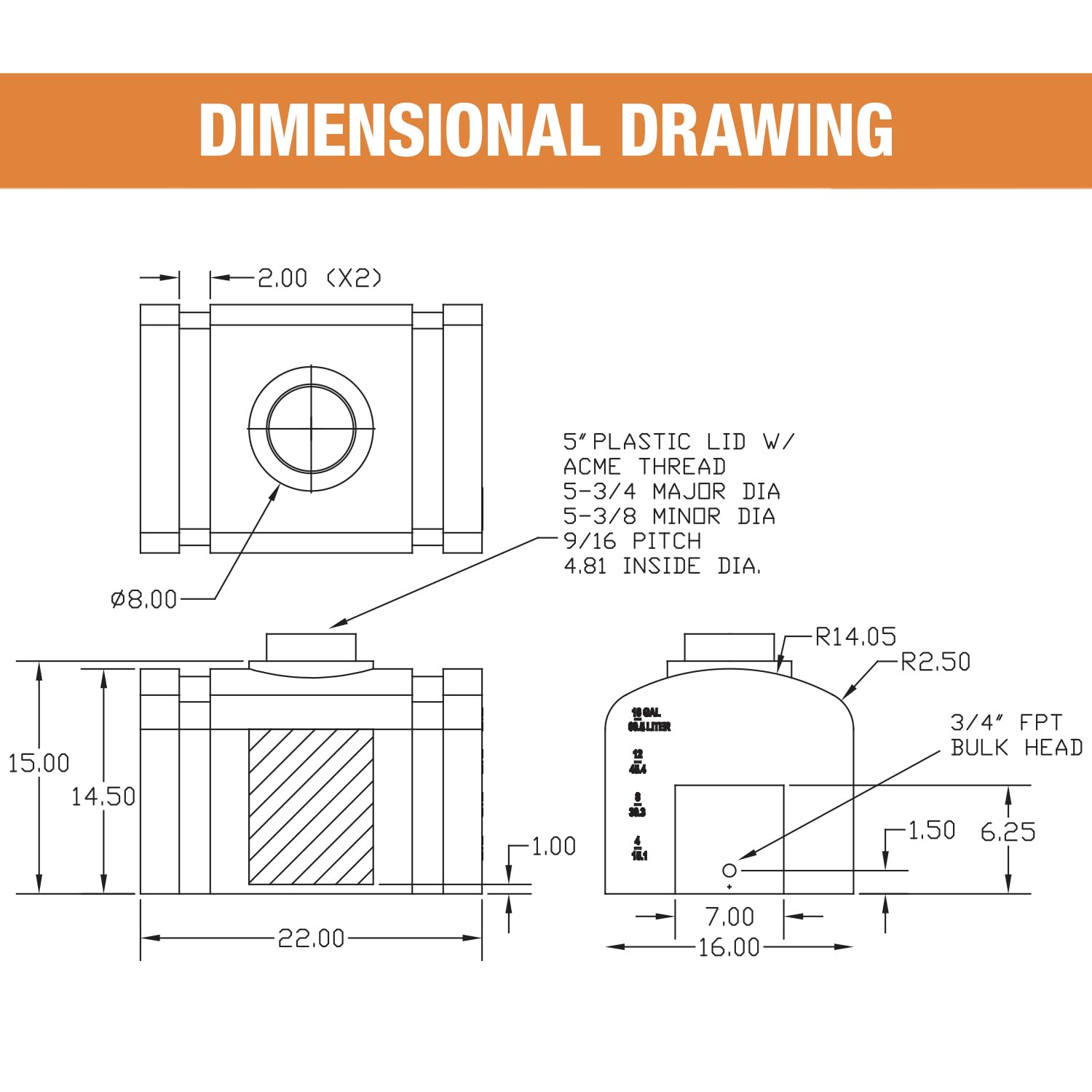 In Indiana, a charge of medium‑density polyethylene enters a rotational mold and emerges as a precise 16 gallon water tank—a horizontal domed reservoir designed for everyday reliability. The natural, translucent wall lets operators verify fluid level instantly, while molded gallon and liter markings provide an exact read. Outdoors, UV‑stabilized poly resists fading and warping; in service, it won’t rust or corrode. A 5‑1/2" lid (5" opening) and easy‑tighten cap simplify refills, and a built‑in bulkhead fitting with a 3/4" NPT outlet makes fast work of draining, siphoning, or hose connection. Molded tie‑down channels accept saddle straps so this portable water tank rides securely as a truck bed water tank or trailer water tank, ready for farm chores, job sites, and water tank for car detailing setups. Rated for non‑flammable liquids to 140°F, it serves confidently as a potable water tank, a rugged water storage tank, or an RV water tank for extended trips. Made in the USA, it’s engineered for cleanability, durability, and dependable performance wherever you need compact capacity and square‑profile stability.