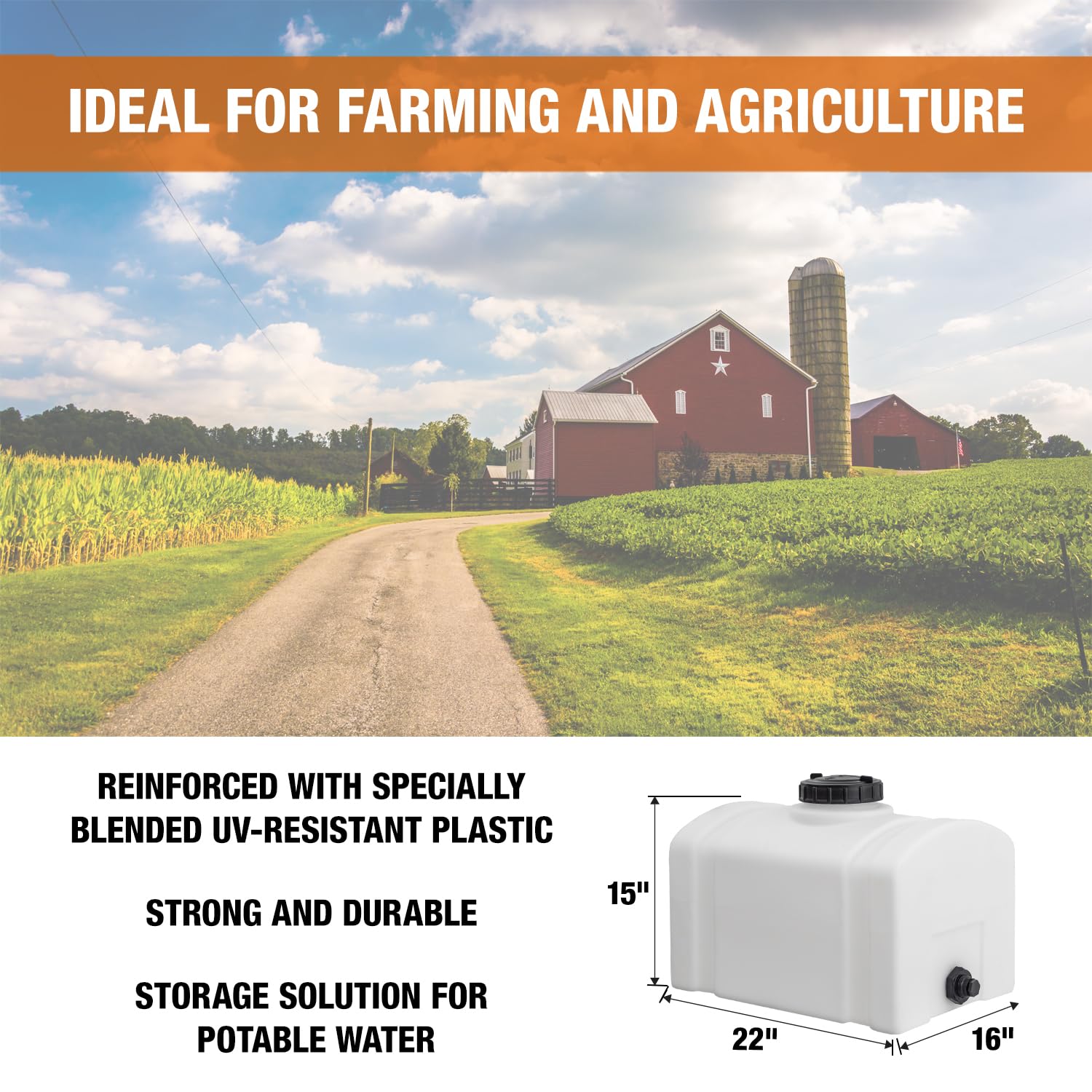 UV-STABILIZED, RUSTPROOF POLY TANK — Medium‑density poly tank resists corrosion and sun; built to live outdoors on farms, work sites, or trailers as a rugged water storage tank that won’t warp, fade, or crack through seasons of daily service.