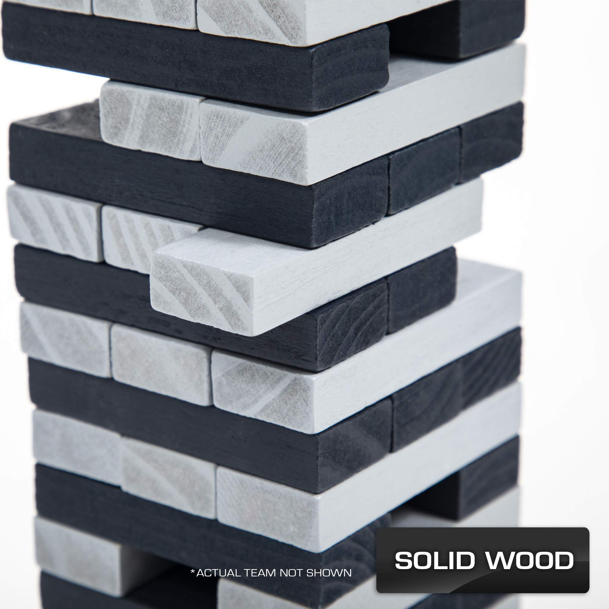 A CLASSIC JENGA GAME, IN YOUR FAVORITE NCAA TEAMS - A wooden block game that challenges players to push and pull stacking blocks from the tower and strategically place them back on top. Last player standing without knocking the tower down, WINS.
