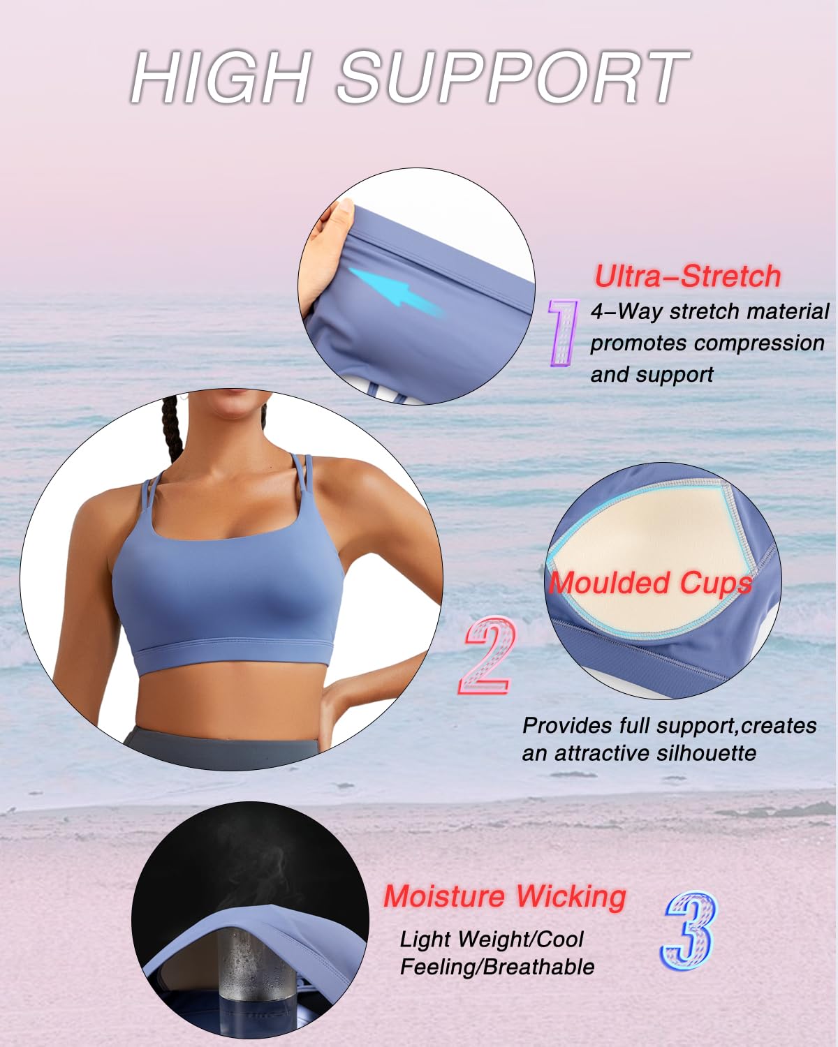 ✅ 【SWEAT OUT IN STYLE! 】: Made from a flexible four-way stretch fabric that supports your body as you move. Enjoy the freedom of movement as the open back styles aim to keep you comfy and cool while you bring on the heat! Running sports bras for women with wide waist band for that support we all need!