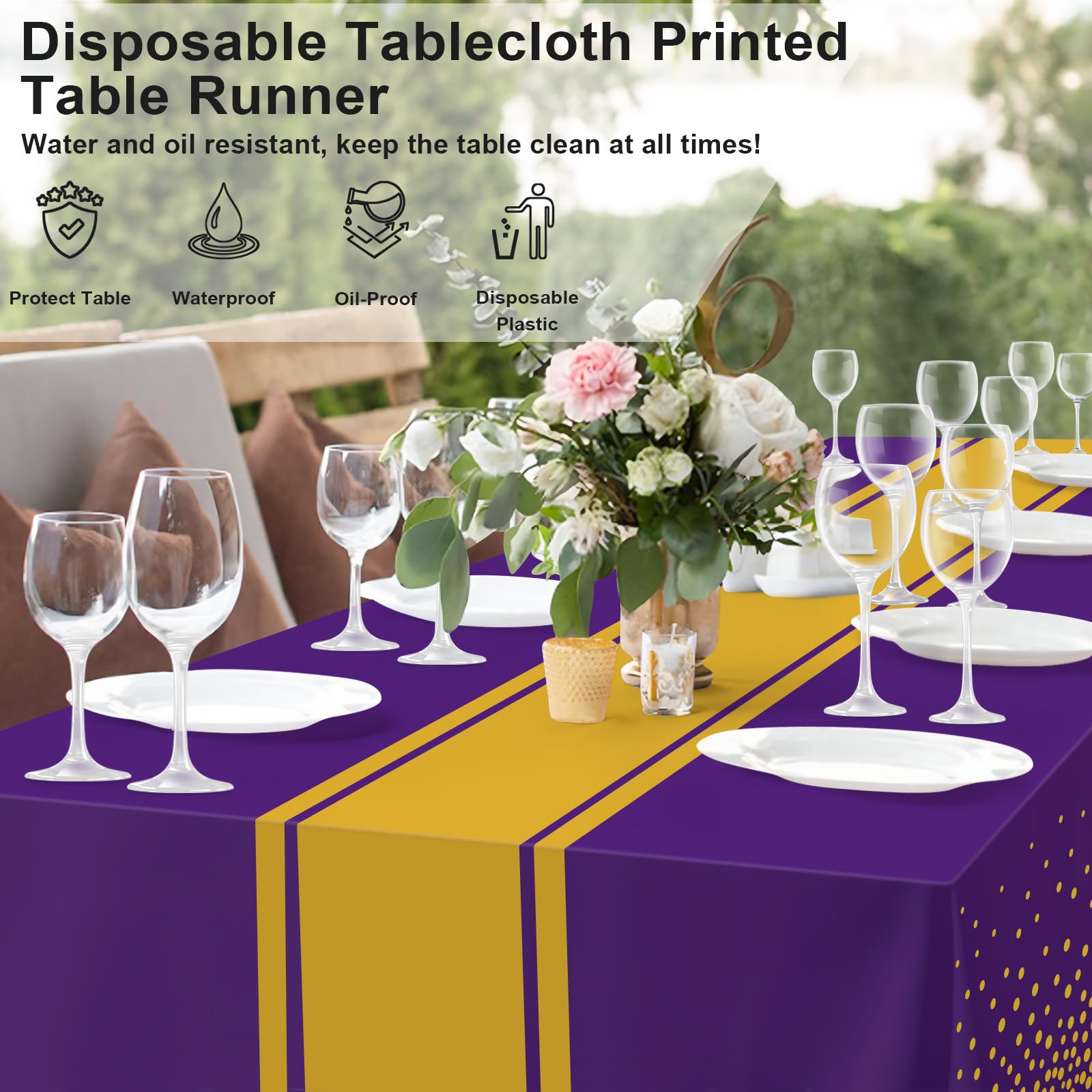 【Durable Plastic Tablecloths】Our purple tablecloth with gold printed table runner is made of premium durable PE material, creating a waterproof barrier that keeps your table fully protected at all times. The disposable purple and gold tablecloth measures 54 x 108 inches, covers an 8-foot table, and can be cut to size. Our package includes a 2-pcs of purple and gold tablecloths, and you'll have enough covers for even big events or multiple occasions