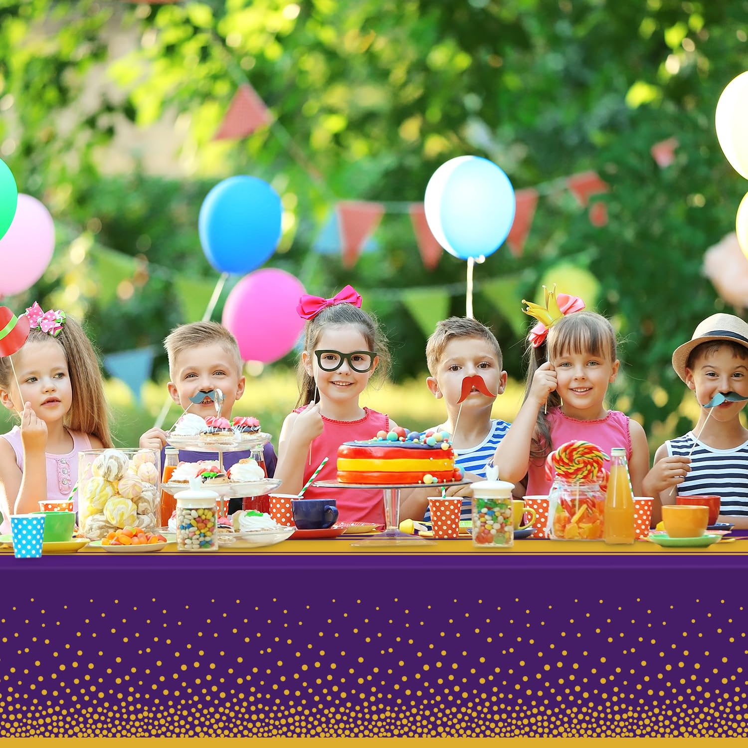 【Multiple Uses】Purple with gold dot and gold printed table runner tablecloths can create a party atmosphere and are perfect for celebrations like birthday party. Suitable for indoor and outdoor use. Ideal for parties, banquets, birthdays, baby shower, picnics, weddings, graduation, Valentine's Day decorations, Thanksgiving dinners, Christmas celebrations, etc. Not only suitable for parties, but suitable for decorating! Plus, purple and gold table cloths for parties can also be used as decorative background banners or graffiti table covers to keep your table clean