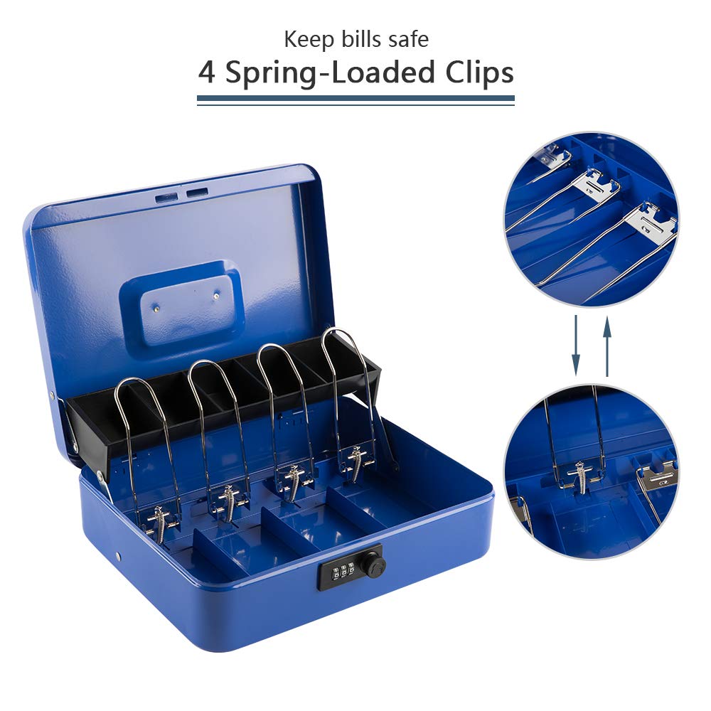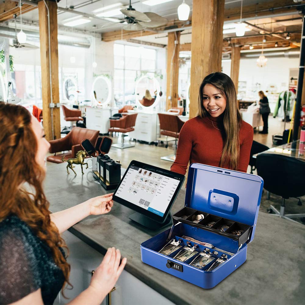 PETTY CASH BOX: This lock box is constructed of durable steel which is solidly built and won't simply burst open if dropped.For indoor and outdoor use. Such as School, Supermarket, Storage Lockers, Cabinets, Family, Yard Sale and so on. Suitable to store bills, coins, checks and receipts.