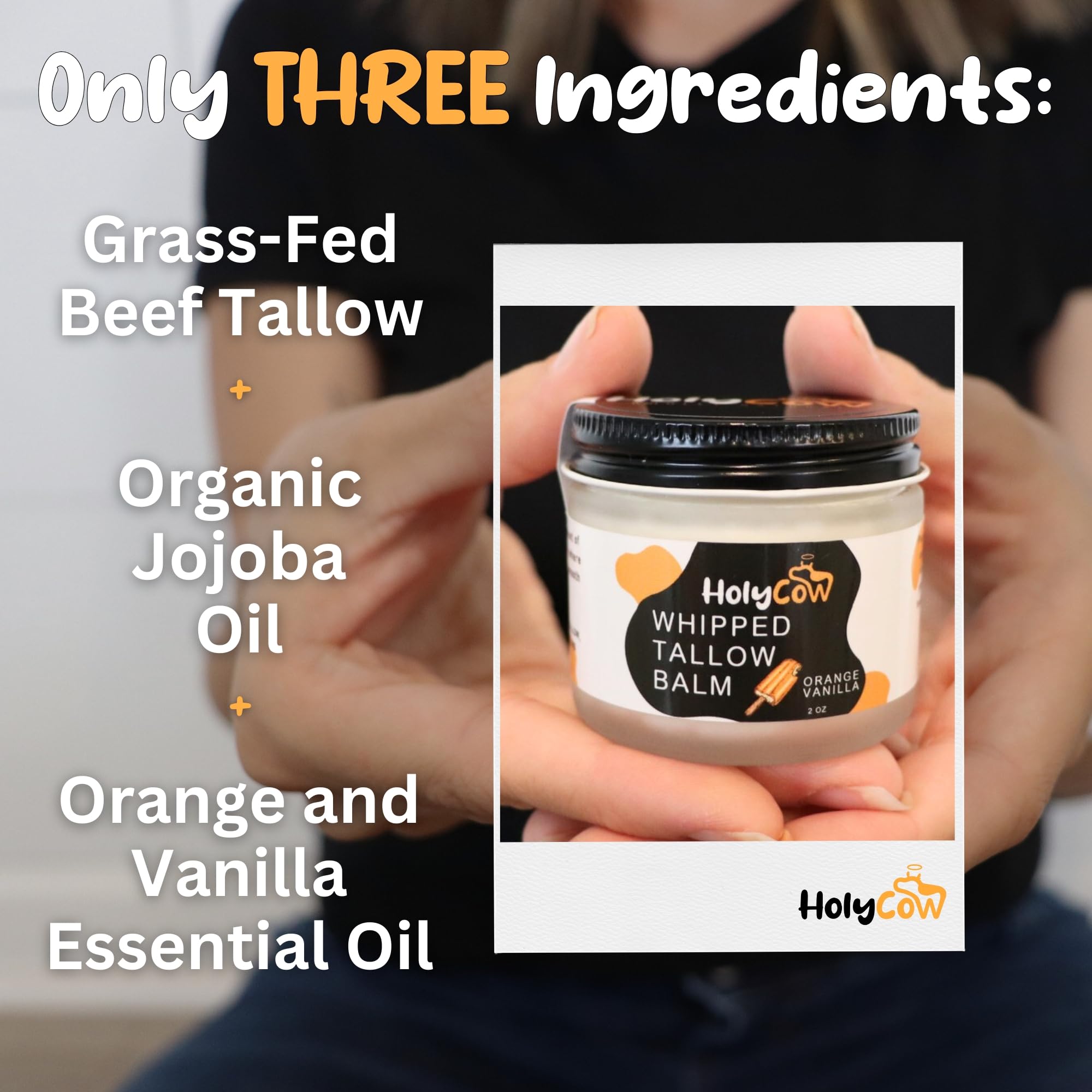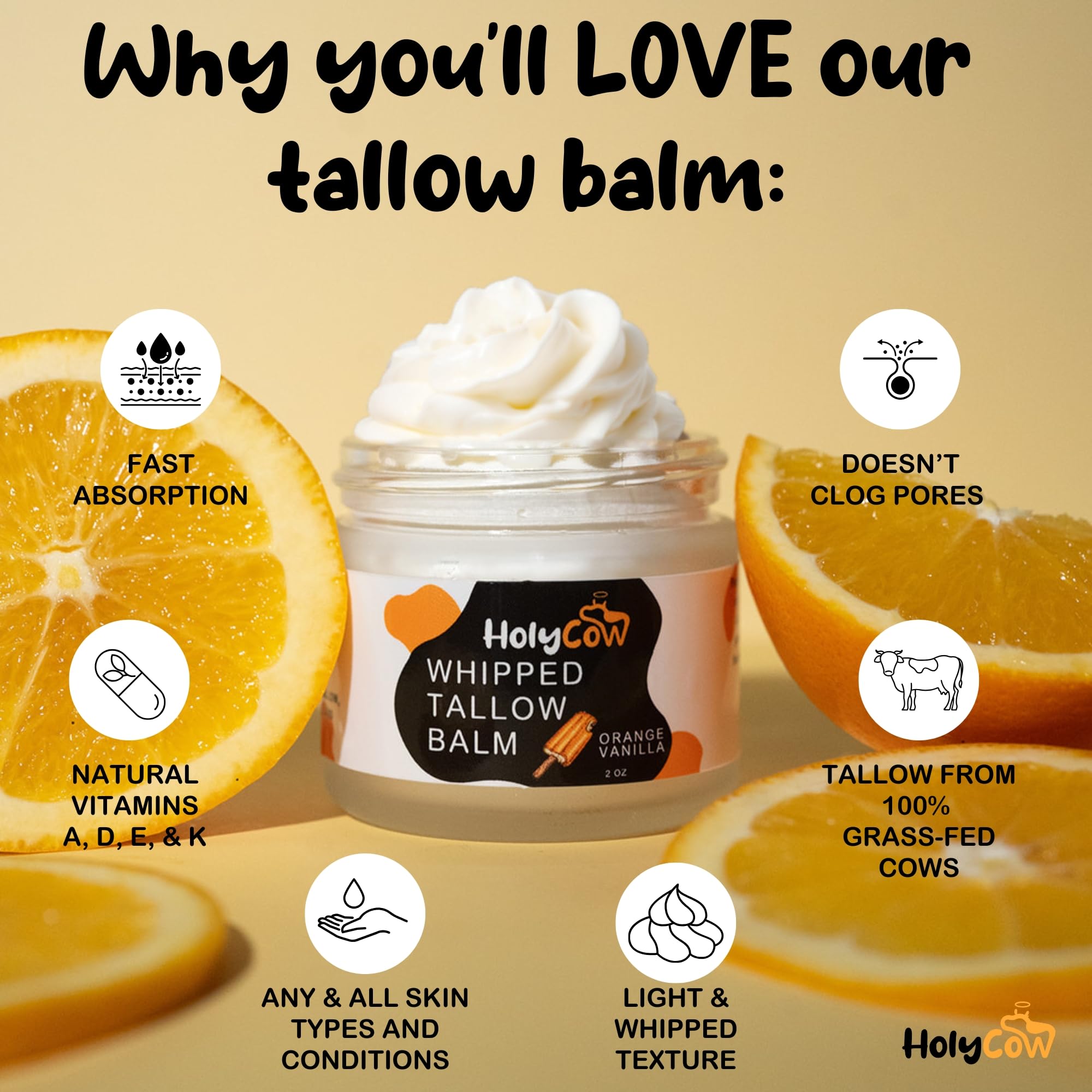 HolyCow Beef Tallow For Skin - Whipped Tallow Balm with Organic Jojoba Oil (Orange Vanilla), Grass Fed Beef Tallow Face Moisturizer for Eczema, Baby, Lip Balm - Lotion For Extremely Dry Skin