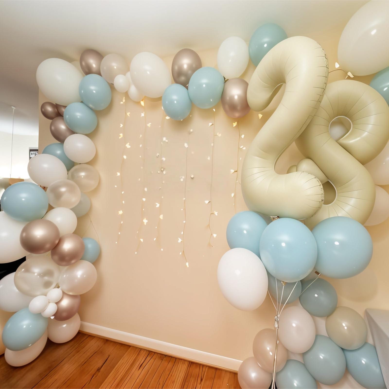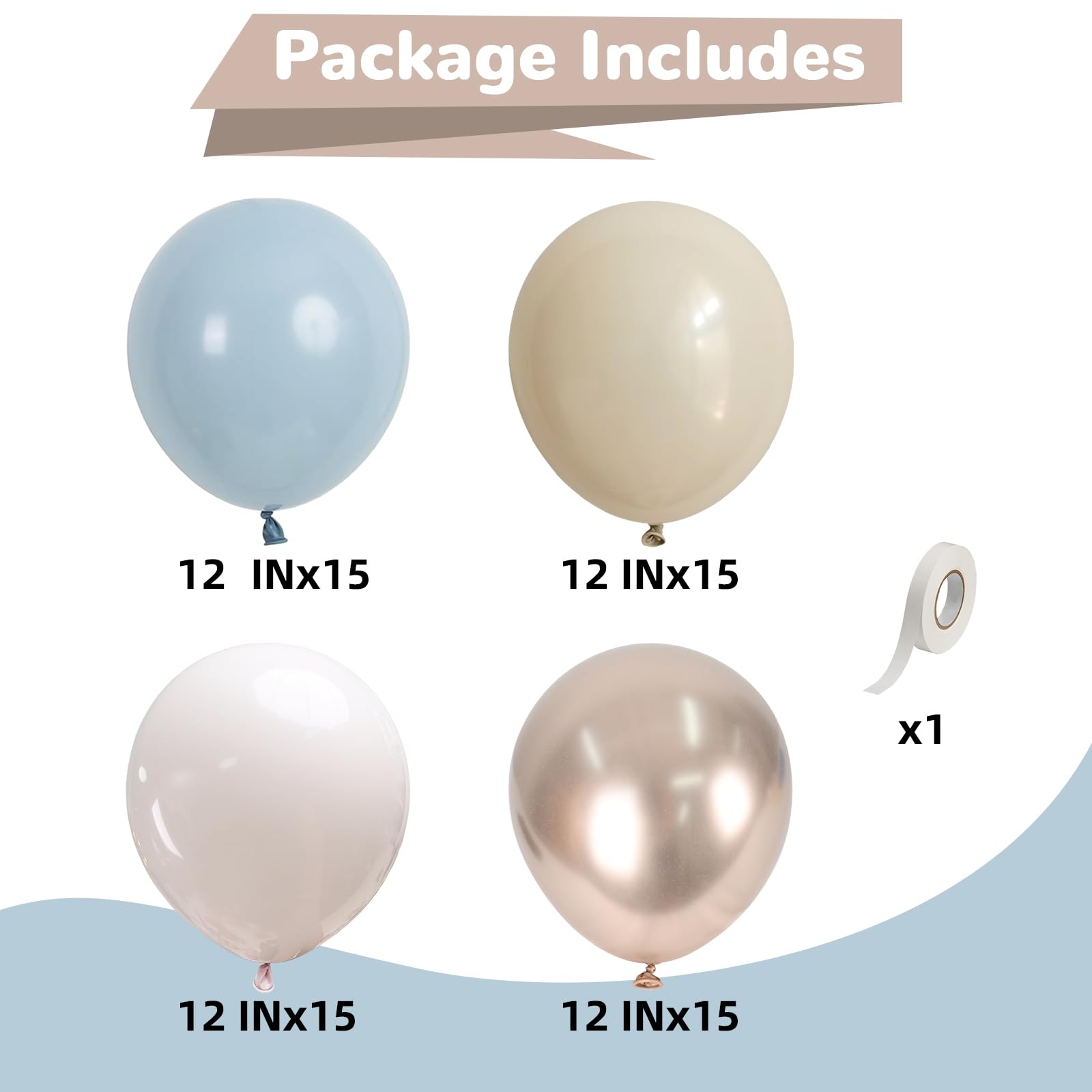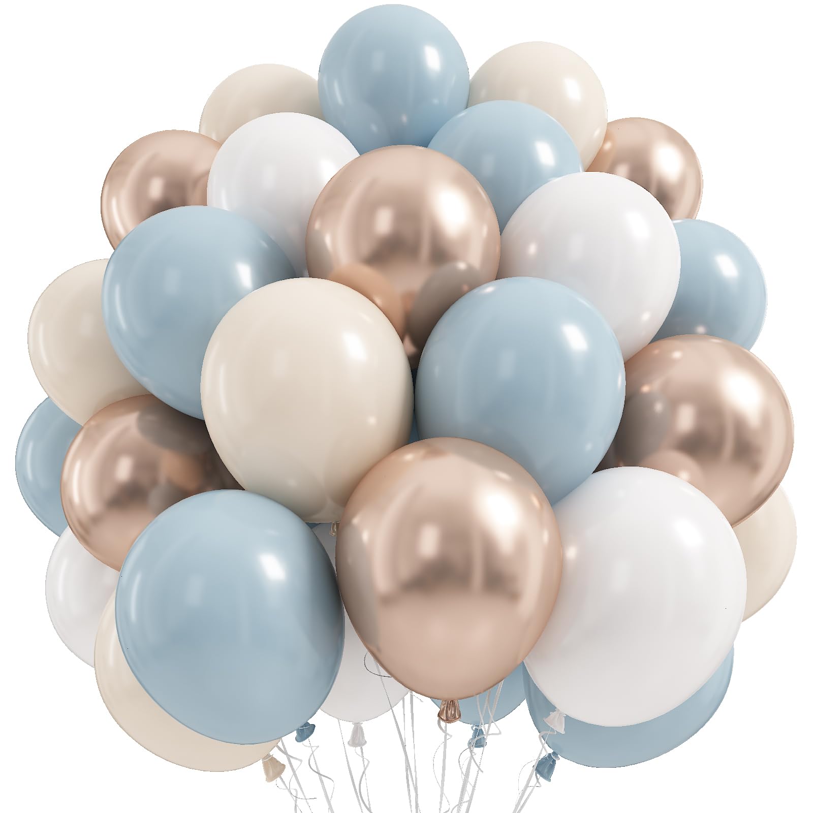 - Birthday balloon Decoration Kit for Birthday Party and Celebrations - Add colorful colors to your celebrations! This blue balloons is for various venues, easily creating a joyful and warm party atmosphere. Each balloon is 12 inches in size, suitable for various venue arrangements, adding fun and vitality to the party. - Applicable scenarios: - Suitable for birthday, wedding, baby shower and many other occasions.Make every special moment more meaningful, whether it is an indoor party or an outdoor celebration. - Configuration:( 12 inch balloons ) - pale blue balloons: 15 pcs - white sand balloons: 15 pcs - white balloons: 15 pcs - metallic gold balloons: 15 pcs - Ribbon: 1 roll Features: - This balloons for birthday party brings a joyful and cute party atmosphere with a variety of balloon designs. - A roll of ribbon can be easily tied to the balloons, simplifying the arrangement process. - Made of environmentally friendly materials, the party balloons decorations are sturdy and durable to ensure long lasting use during the party. - Warm reminder: - To ensure the best effect of the balloons 12 inch, please avoid over inflation and keep away from sharp objects. - Use latex balloons assorted colors under adult supervision to ensure safety. - Not suitable for children under 3 years old. - Suitable for indoor and outdoor use, avoid direct sunlight and high temperature environment.
