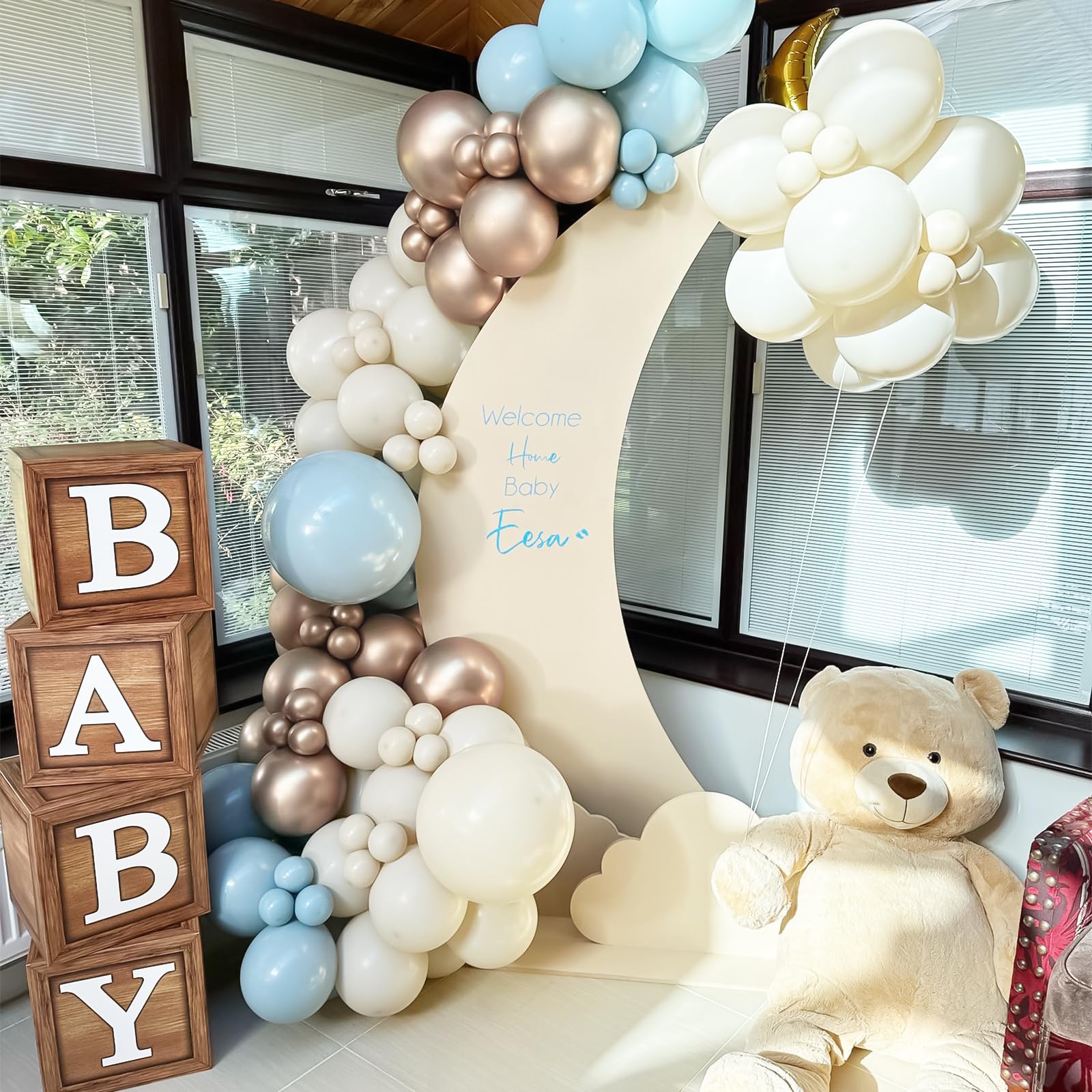 Baby Shower Boy Decorations: Includes 12 inch 15 pcs slate blue balloons, 12 in 15 pcs sand balloons, 12 in 15 pcs white latex balloons, 12 in 15 pcs champagne helium balloon and a roll of balloon ribbon