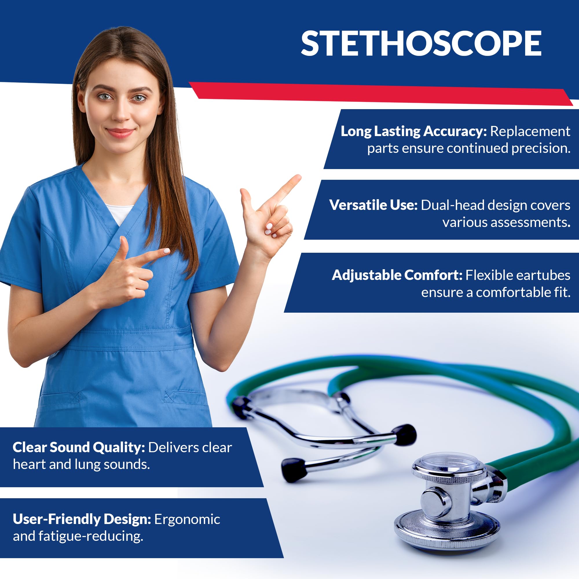 DUAL-HEAD SPRAGUE STETHOSCOPE - Designed for patients of all ages, the sprague stethoscope is great for nurses, doctors, and medical students looking for a high quality stethoscope. The eartubes are designed to be flexible and adjustable to ensure the most comfortable possible fit for the user, and the extra earpieces provided can be swapped out for a custom fit.