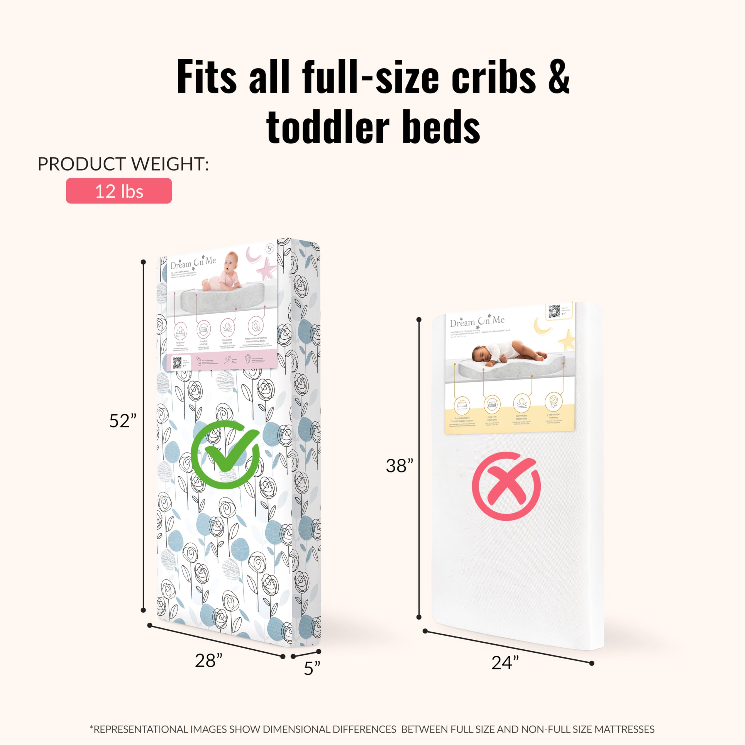 LIGHTWEIGHT & DURABLE: The mattress weighs only 6 lbs. and is made to make change of bedding a breeze. It’s square corner design provide a snug fit in standard cribs. Mattress Dimensions: of 52” L x 28” W x 5” H (inches)