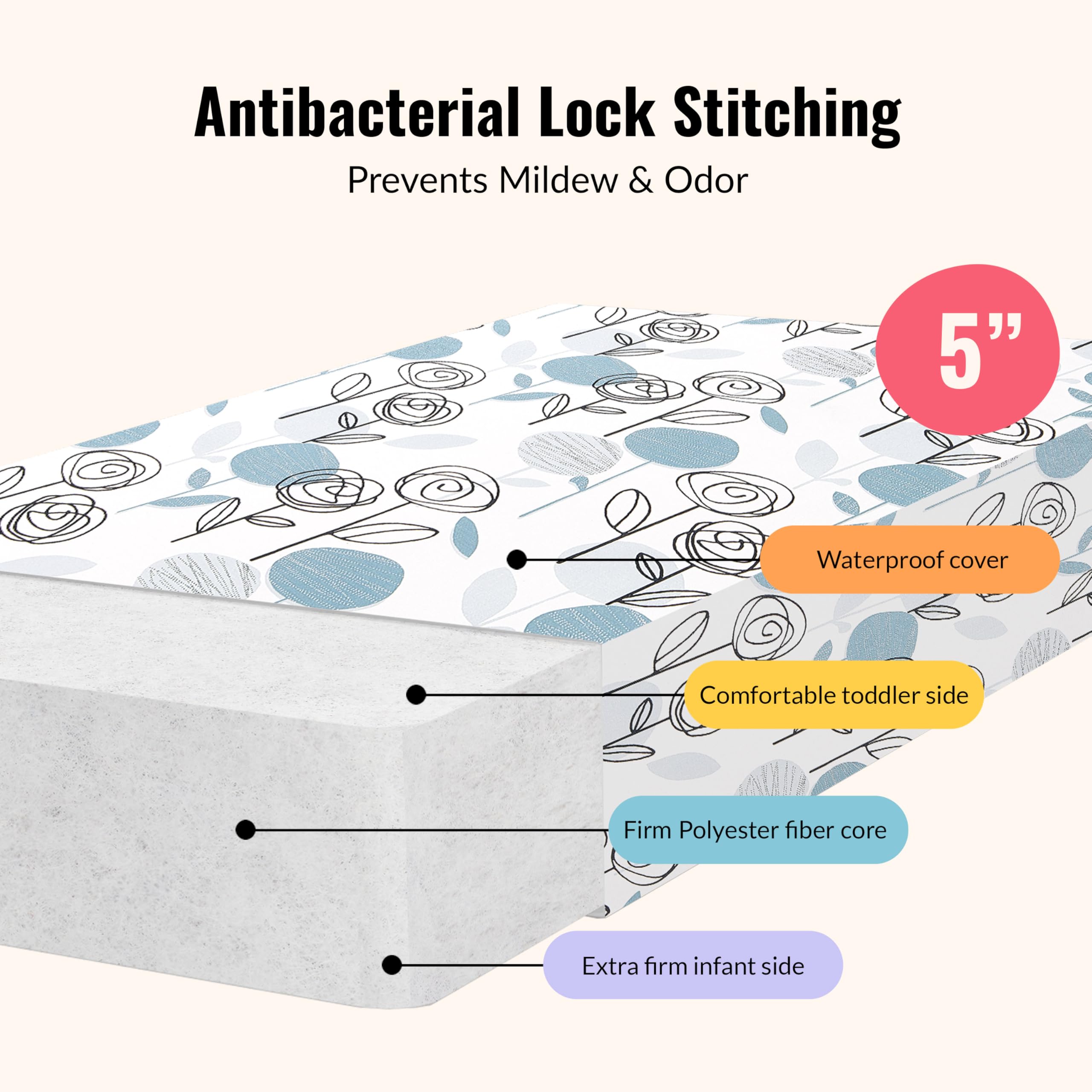 Contemporary & comfy for peaceful nights of slumber! Bring home the Dream On Me Floral Dreams Firm Fiber Standard Crib Mattress to complete your nursery necessities. Designed to adapt to your little one’s growing body with pediatrician-recommended firm fiber, it combines durability & safety. This 5-inch Crib & Toddler Mattress is packed with necessary elements to keep you and your baby sleeping soundly like a Greenguard Gold Certification, JPMA certification, Federal Flammability Standards certifications and a 5-year limited warranty! What’s more, this adorable mattress comes in 2 finishes – fresh, earthy Teal and minimal flower power Rose Pink! It’s lightweight at just 6 lbs. with a waterproof soft vinyl cover, making it easy to clean, and dimensions of 52” L x 28” W x 5” H (inches).