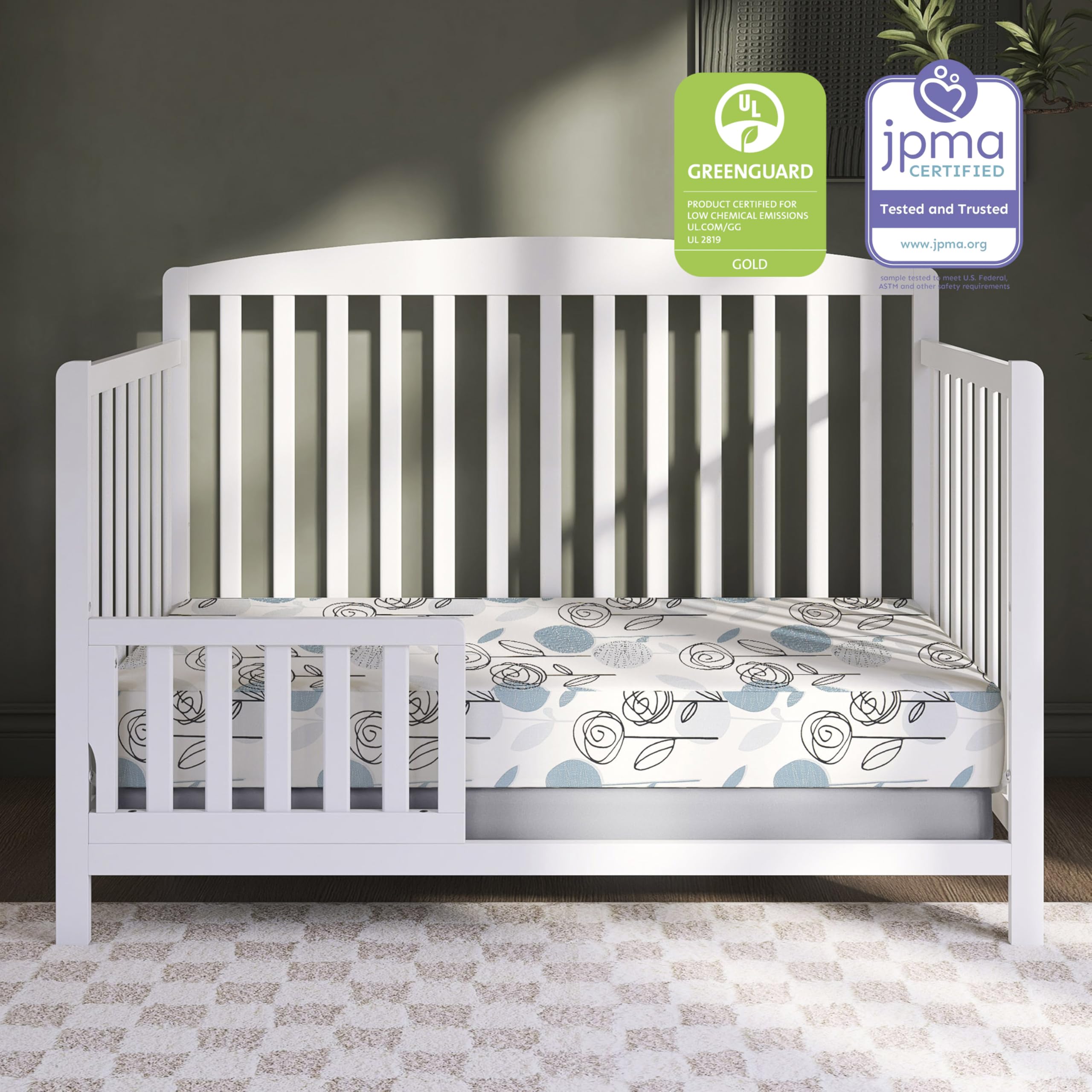 SAFETY ASSURED: The Floral Dreams Firm Fiber Mattress meets 16 CFR 1632/1633 Federal Flammability standards. It is Greenguard Gold and JPMA certified. They’re also designed, engineered, and proudly made in the USA