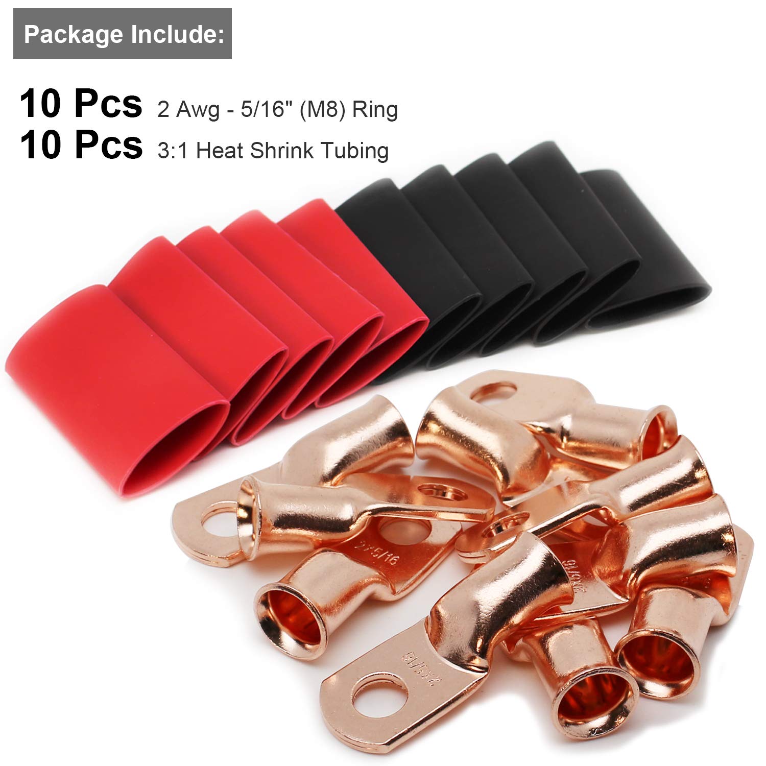 【What You Get:】 10 Pcs per pack of 2 Guage (AWG) 5/16" ring terminals, copper lugs closed end termination ring terminals with 10 Pcs 3:1 Dual Wall Adhesive Heat Shrink Tubing Tube for your work(5pcs Black and 5pcs Red).